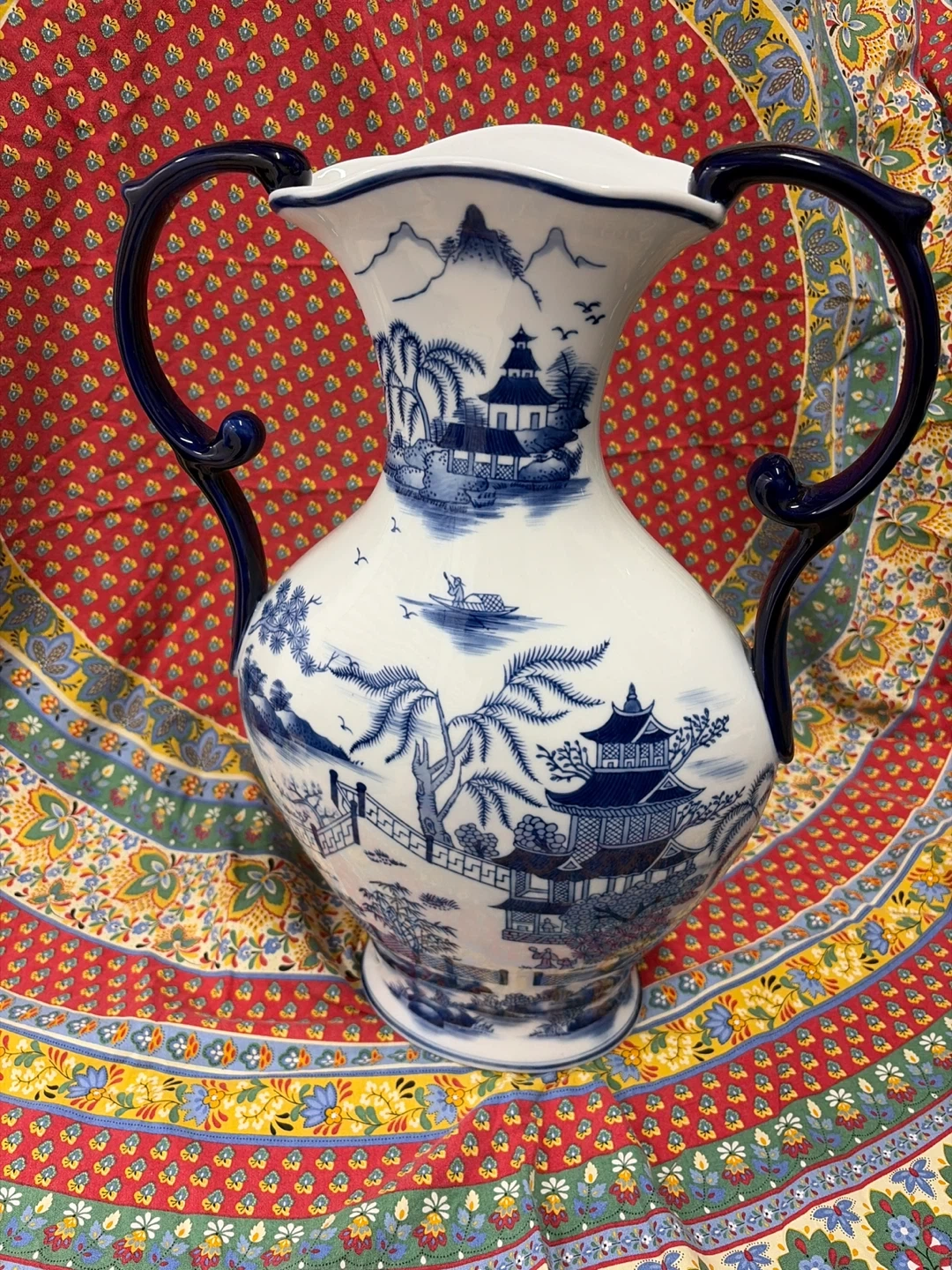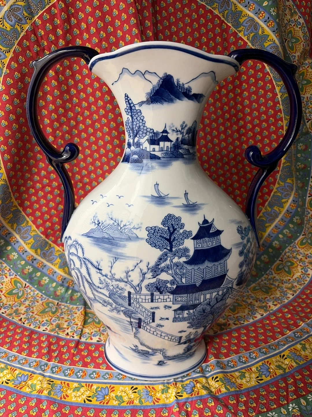 Blue and white porcelain vase featuring a traditional Willow pattern. It has two handles and a wide opening. Made in China.