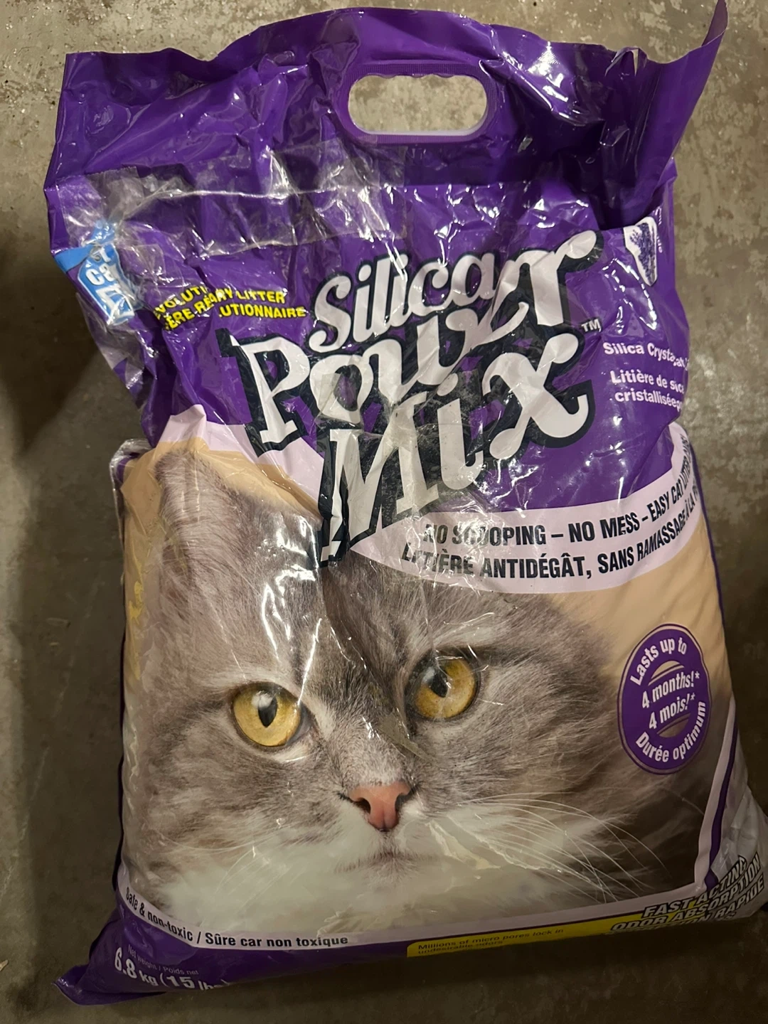 Silica Pour Mix cat litter. It's a non-toxic and fast-absorbing silica crystal litter. Lasts up to 4 months!