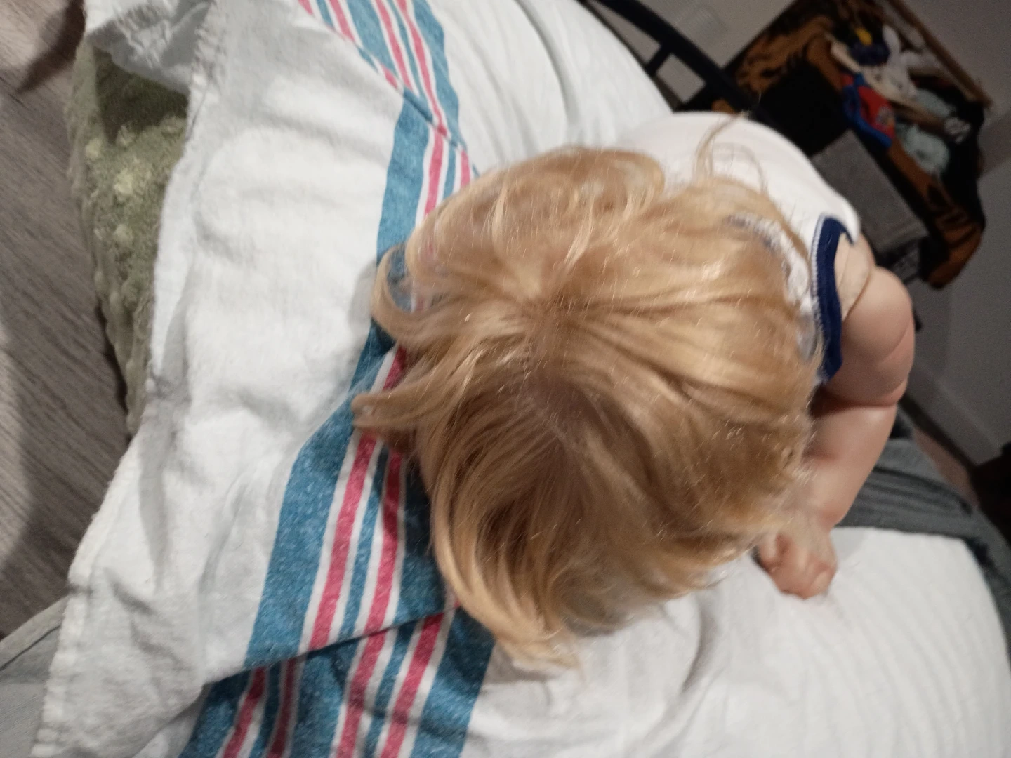 Lifelike reborn baby doll with blonde hair and a blue pacifier. It's wearing a striped tank top onesie. The doll has realistic skin texture and detailed features. It was painted by Alexis by c. Brace it was weighted and modified by me it can take a actual bottle you can give formula but make sure you flush out with water it's a drink and wet it comes with extra outfits and he can take a modified pacifier