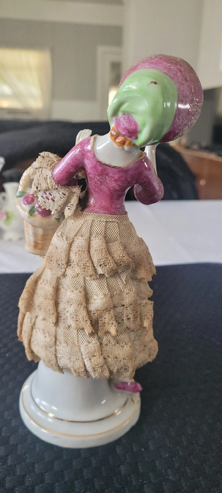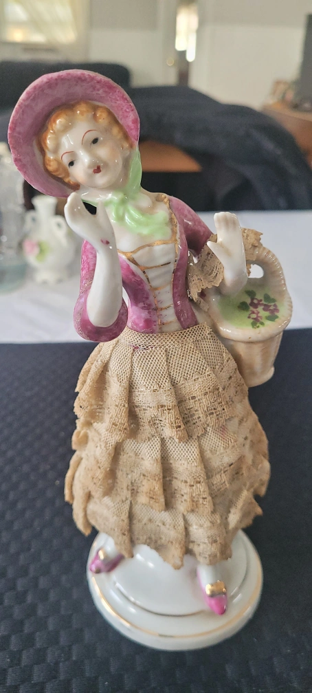 Vintage Porcelain figurine of a lady in a pink dress and hat, with lace detailing on thr skirt. She is holding a basket with flowers.