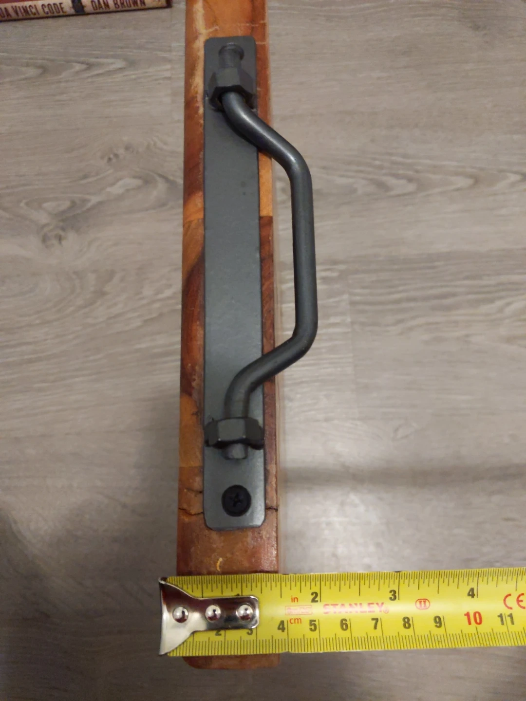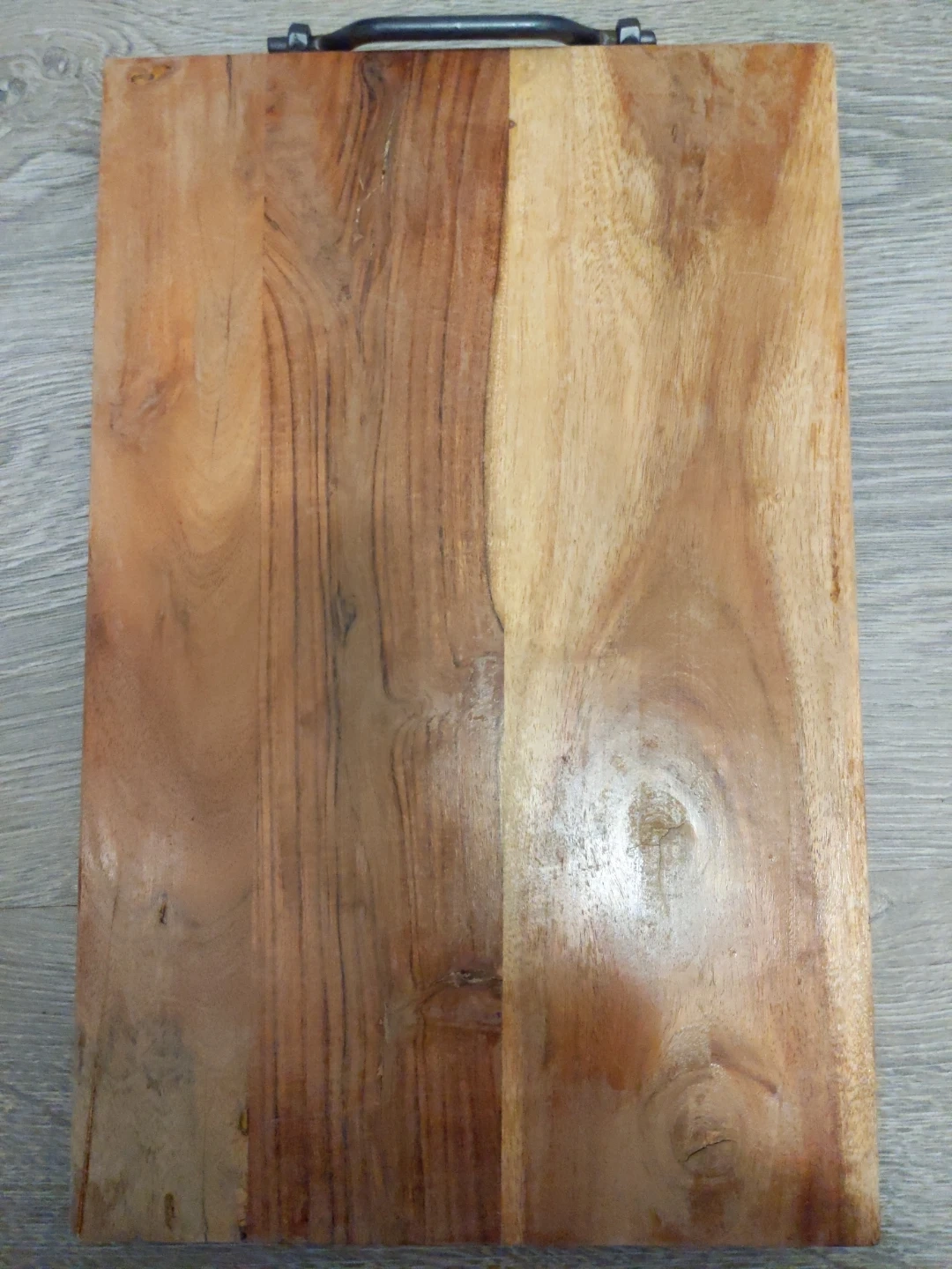 Selling a wood cutting board! It features a convenient metal handle for easy carrying and serving.