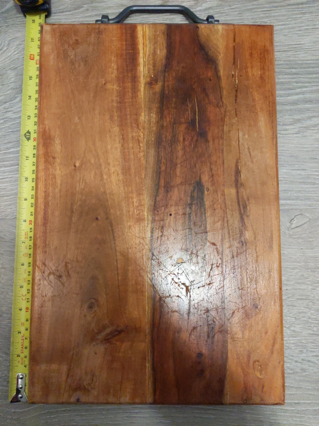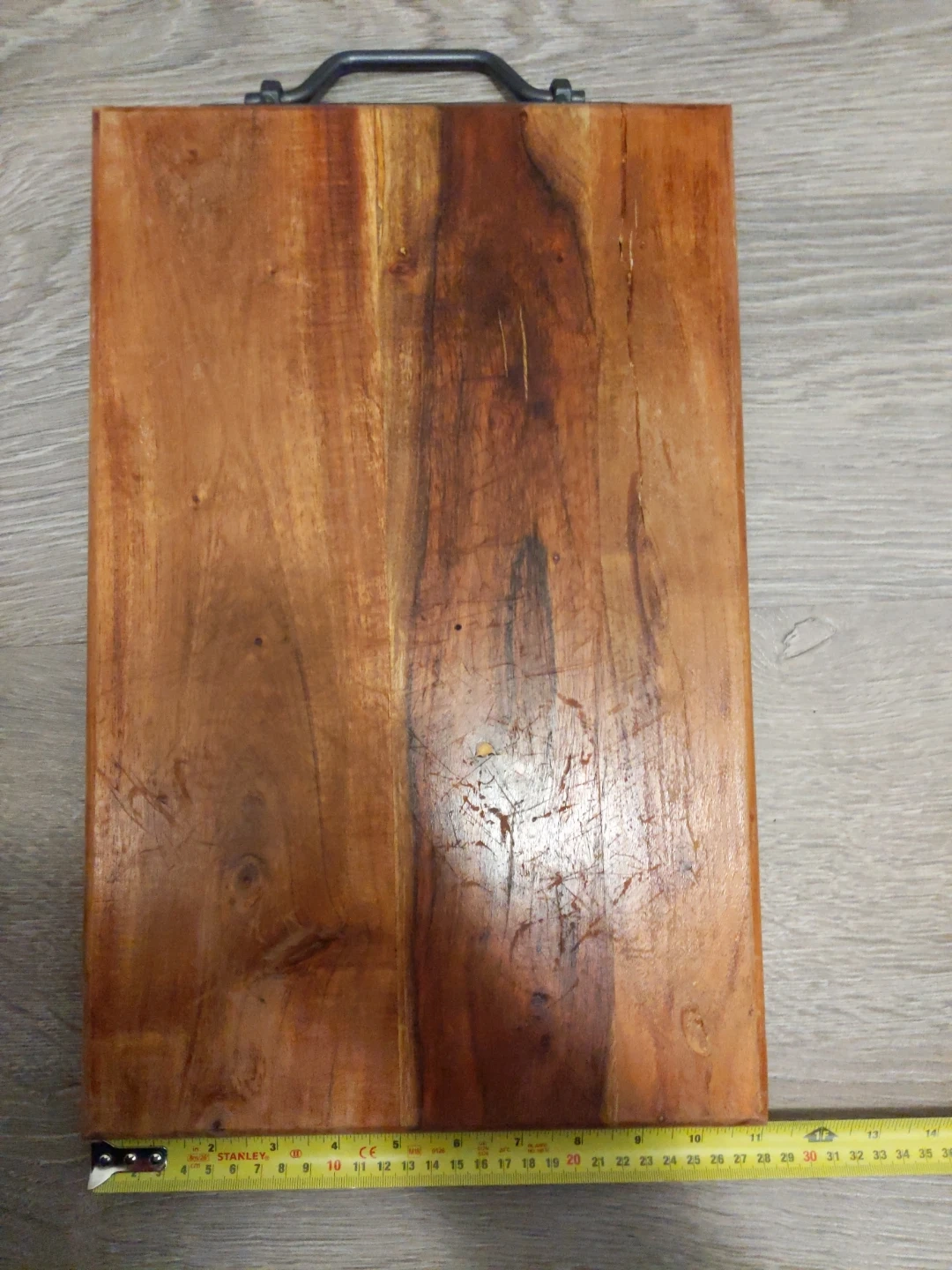 Selling a wood cutting board! It features a convenient metal handle for easy carrying and serving.