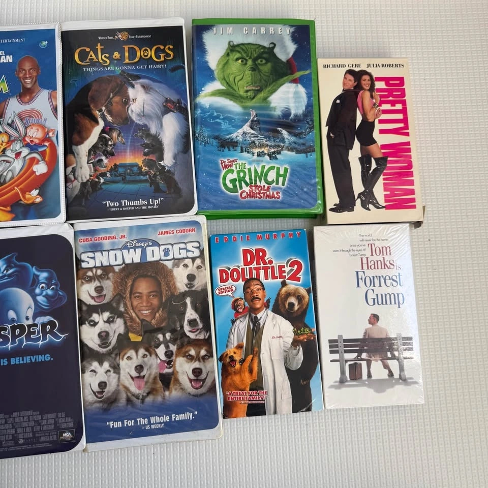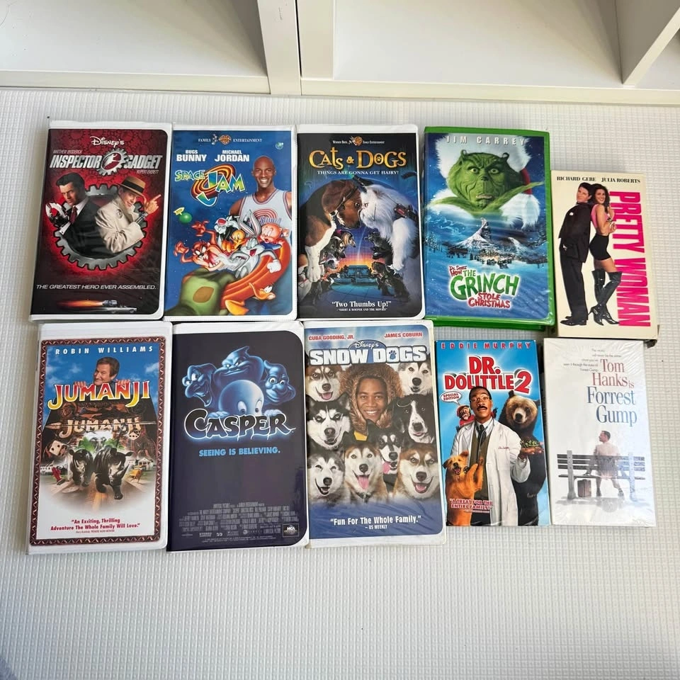 Awesome collection of 10 VHS movies! Has classics like Space Jam, The Grinch, Jumanji, Pretty Woman, Inspector Gadget, Casper, Dr. Dolittle 2, Cats & Dogs, and Snow Dogs. The Forrest Gump tape is still factory sealed. Others are in great shape. Asking $25 for the lot, or $3 each.