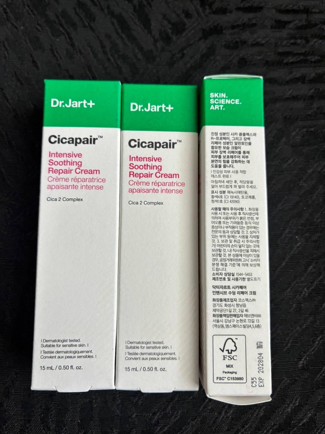 This is Dr.Jart+ Cicapair Intensive Soothing Repair Cream. It's suitable for sensitive skin and dermatologically tested. The cream contains Cica 2 Complex. This is a 15ml size. X 3
