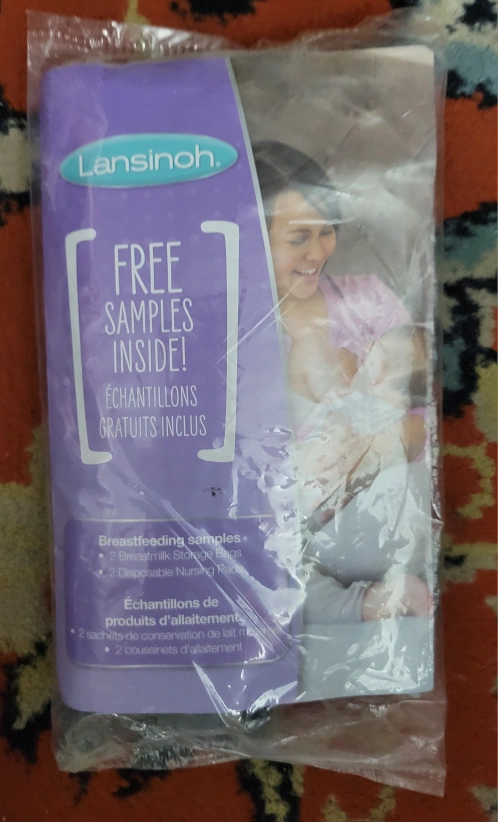 I have a pack of Lansinoh Breastfeeding samples that includes 2 Breastmilk Storage Bags and 2 Disposable Nursing Pads. It's brand new and sealed in the original packaging, never opened!
