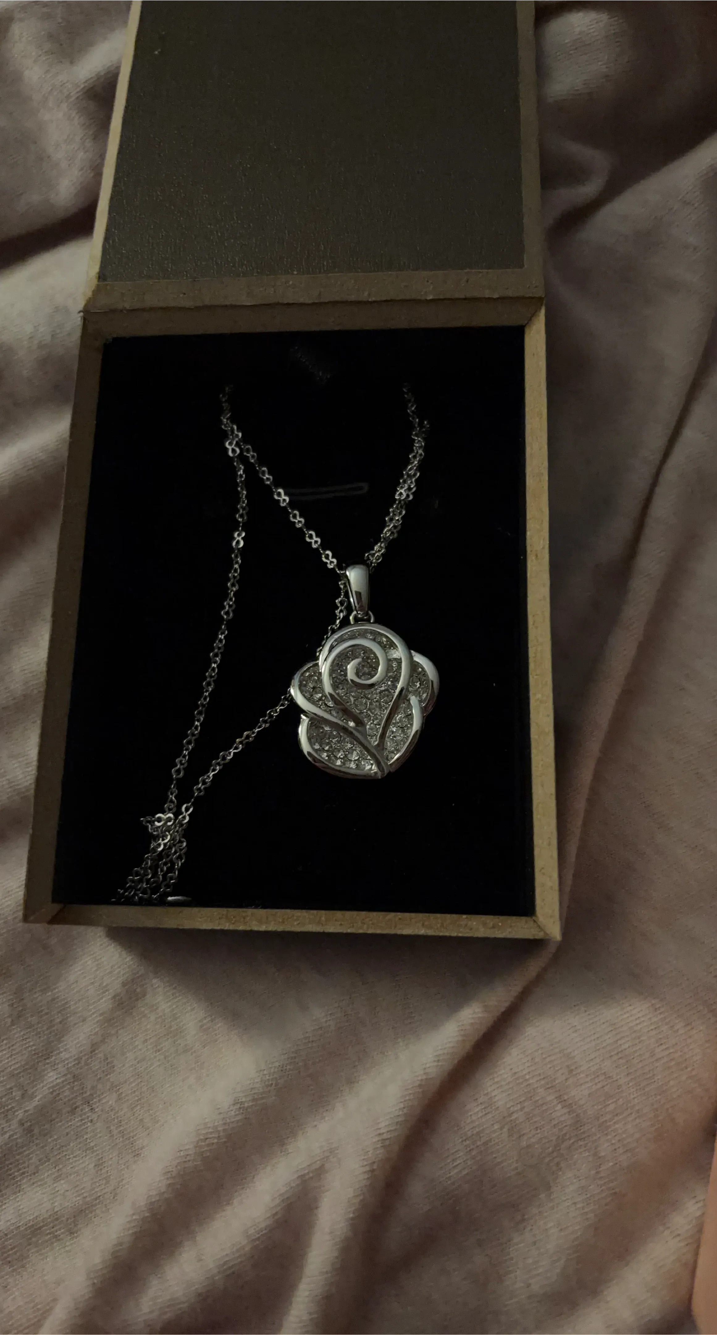 Selling a lovely silver heart necklace. It comes in a box, perfect for gifting or keeping it safe. The heart pendant is detailed and sparkly, adding a touch of elegance to any outfit