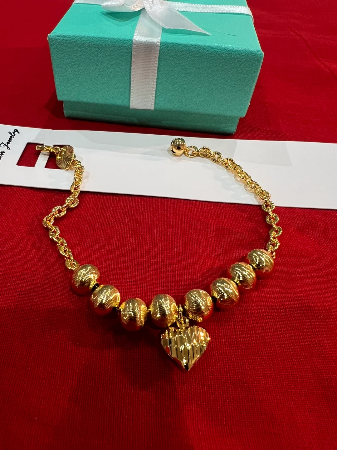 This is a beautiful gold bracelet with a heart charm! It comes with the box, perfect for gifting or keeping it safe when you're not wearing it