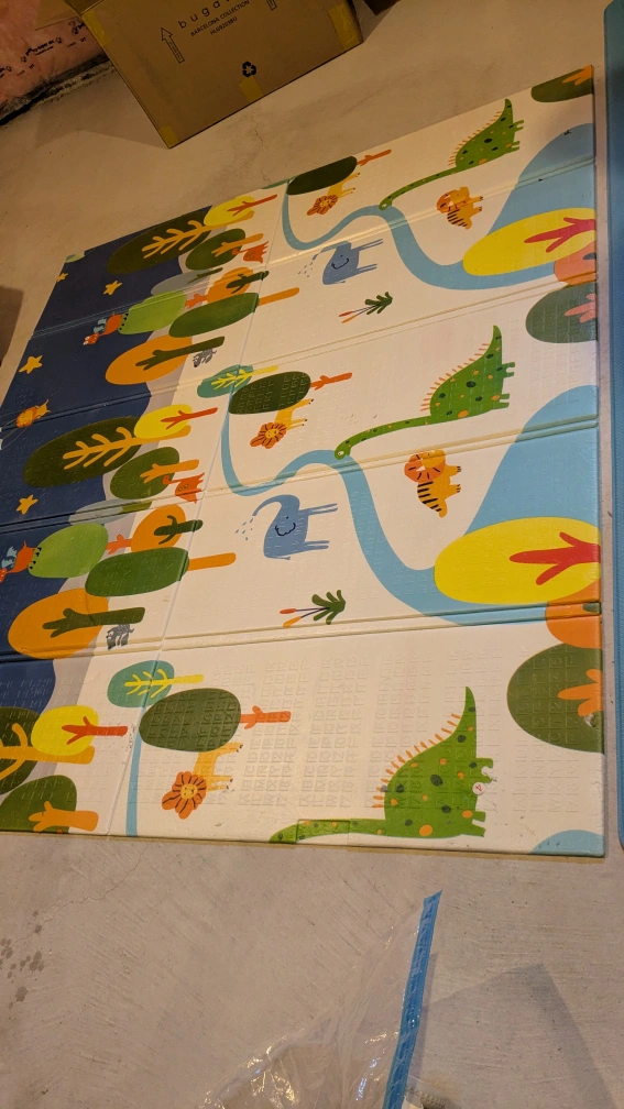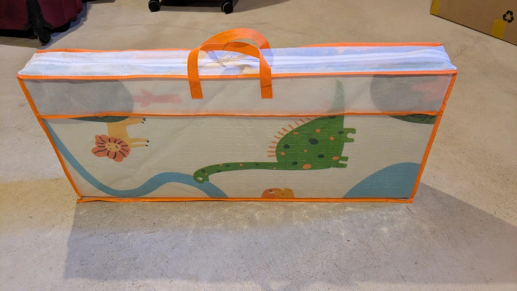 Play mat with a cute design, perfect for kids! It comes with a carrying case for easy storage and portability. Great for creating a soft and safe play area