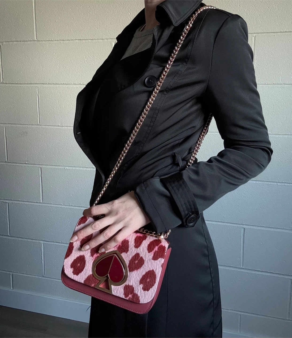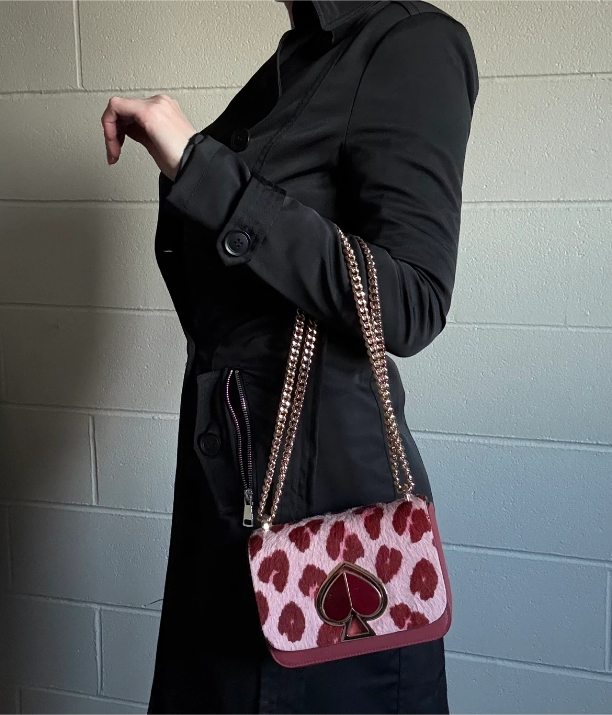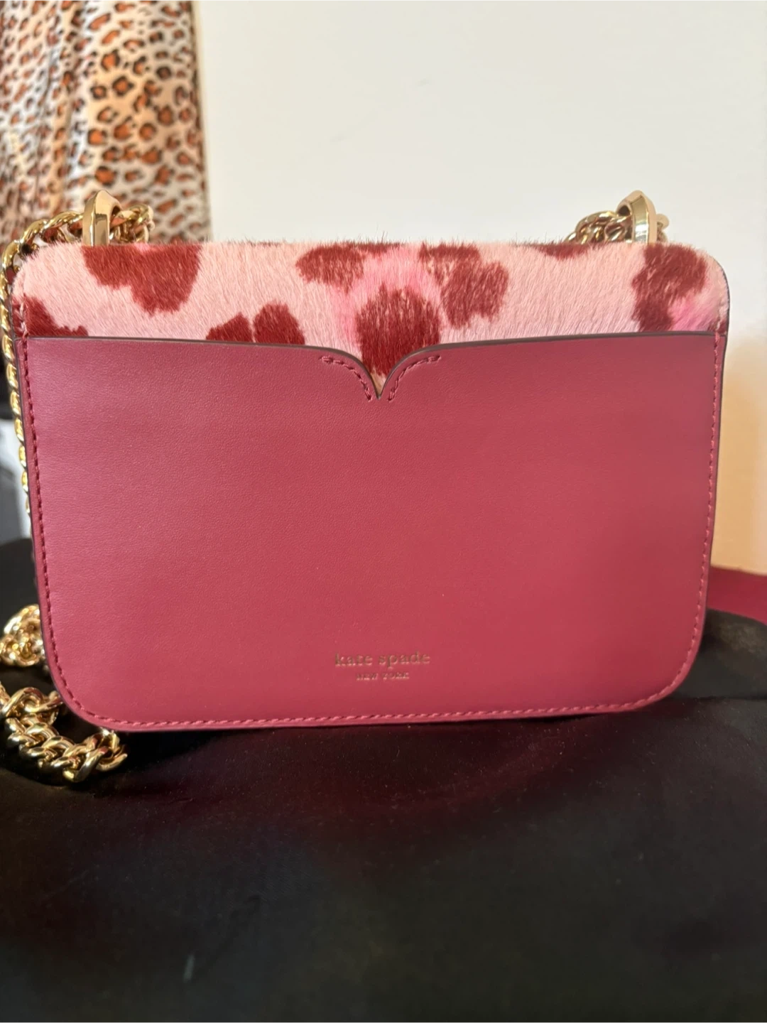 Selling a Kate Spade crossbody bag with a fun, unique design. It features a pink and brown animal print on the front with a gold chain strap. The interior is a matching maroon colour. Perfect for adding a pop of style to any outfit!