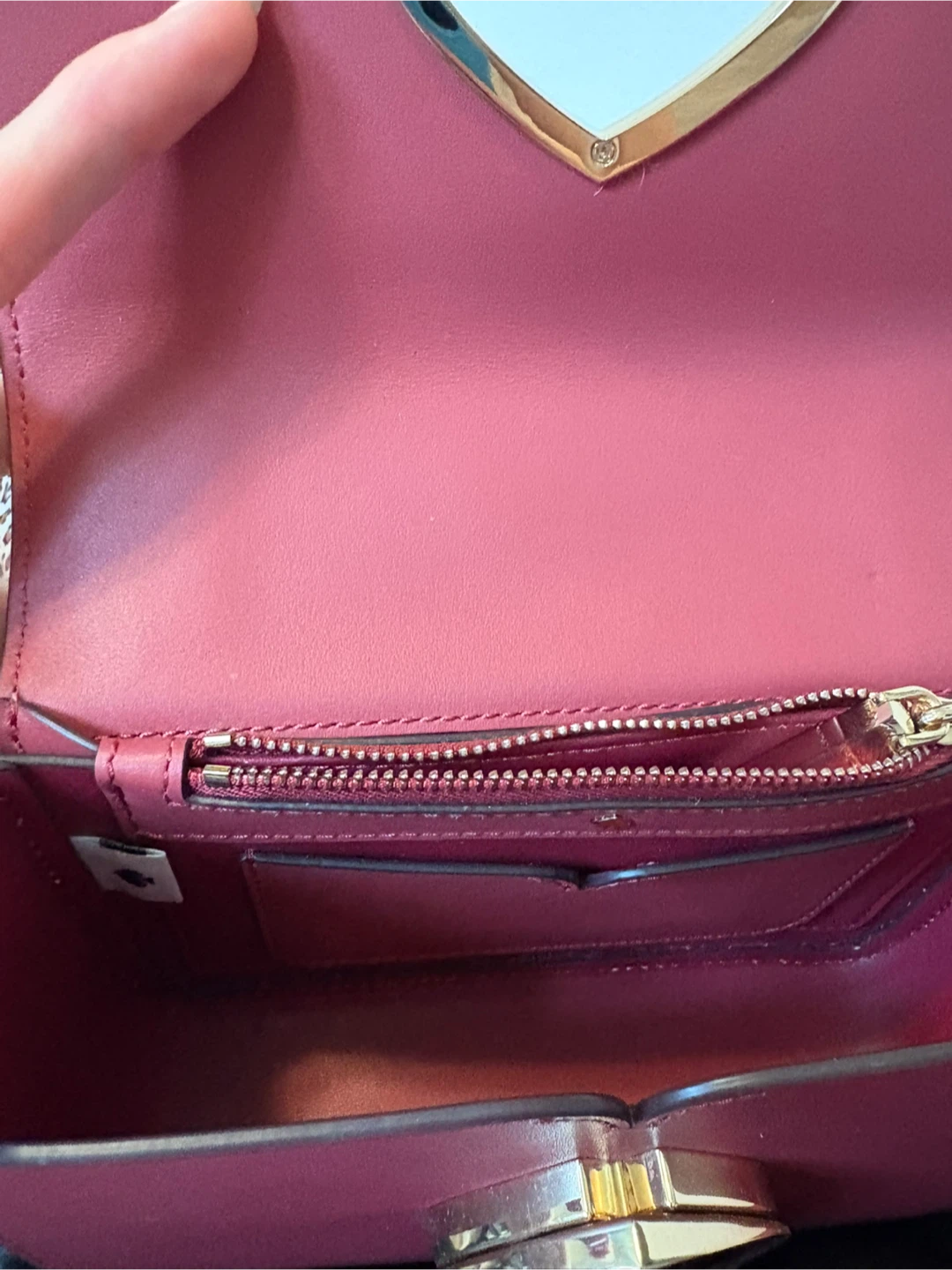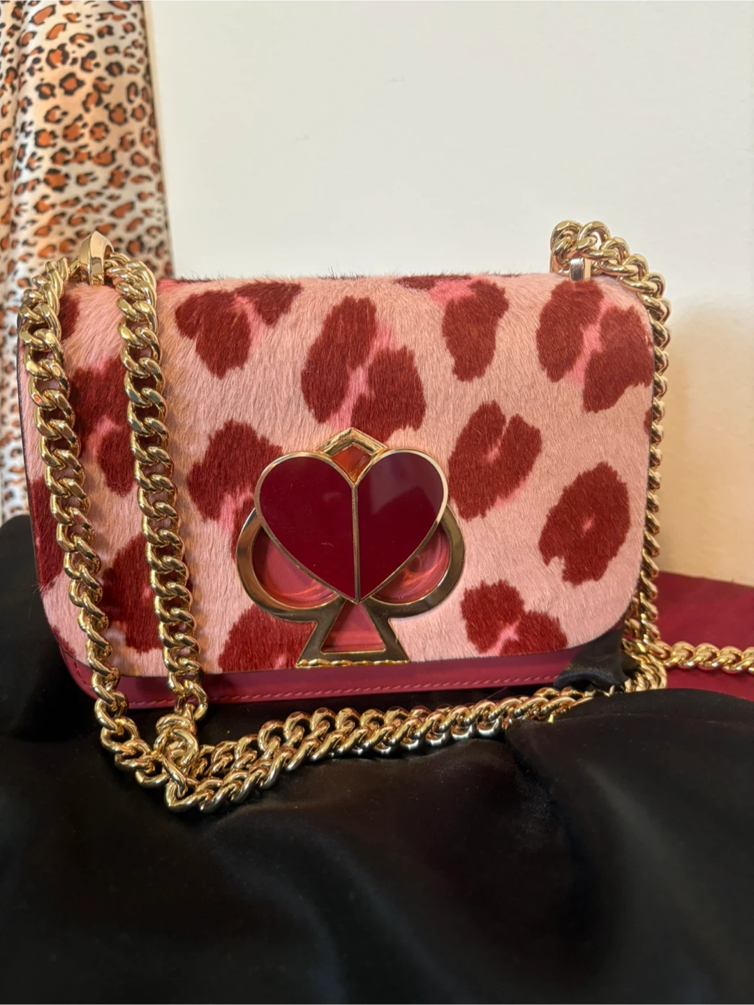 Selling a Kate Spade crossbody bag with a fun, unique design. It features a pink and brown animal print on the front with a gold chain strap. The interior is a matching maroon colour. Perfect for adding a pop of style to any outfit!