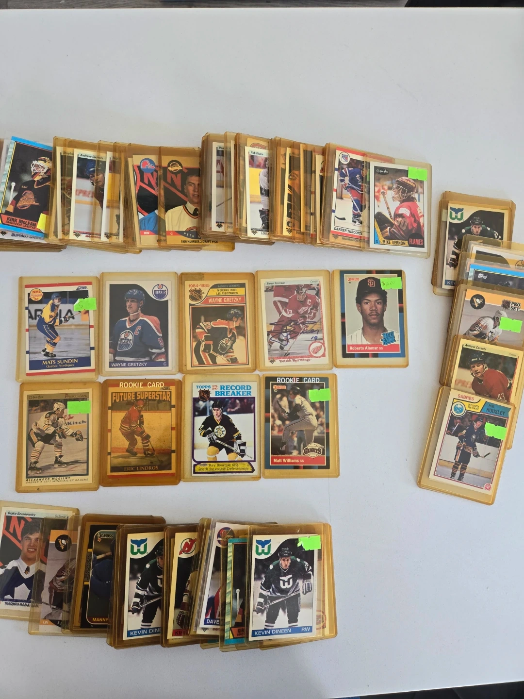 A collection of hockey cards featuring various players like Wayne Gretzky, Mats Sundin, and Eric Lindros. This lot includes rookie cards and record breakers. Most cards are in protective sleeves. Great condition, have been in a box of 20 years. Signed Steve Yzerman, 2 Gretzkys, bunch of rookie cards.