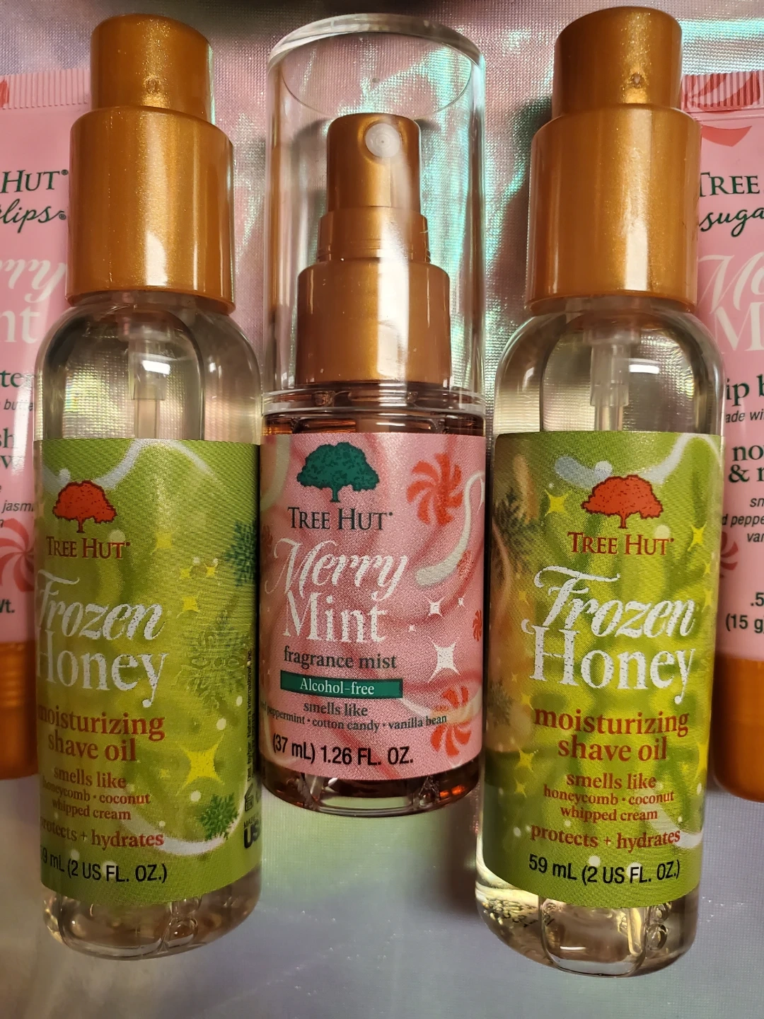 Here's a set of Tree Hut goodies! You get two Frozen Honey moisturizing shave oil (59 mL) and the Merry Mint fragrance mist (37 mL). The shave oil smells like honeycomb, coconut, and whipped cream, while the fragrance mist smells like peppermint, cotton candy, and vanilla bean.