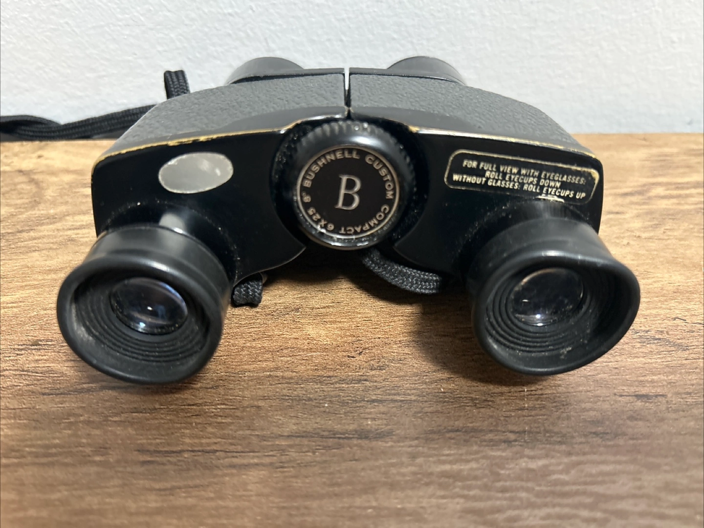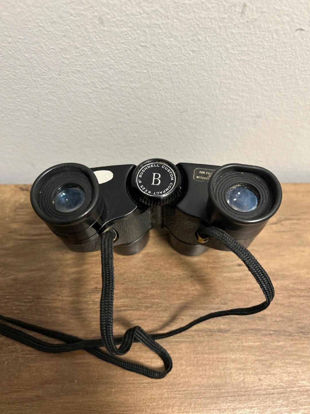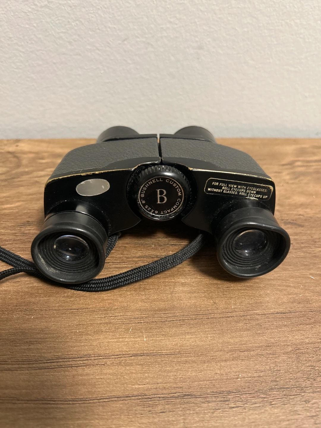 These are Bushnell Custom Compact binoculars with a 6x25 magnification. They are black and come with a neck strap. These binoculars are great for getting a closer look at distant objects.