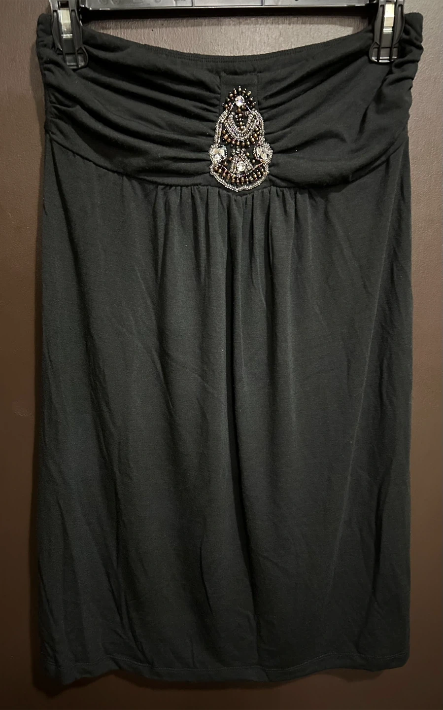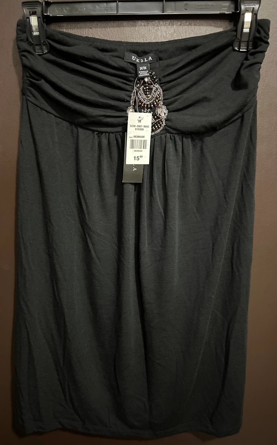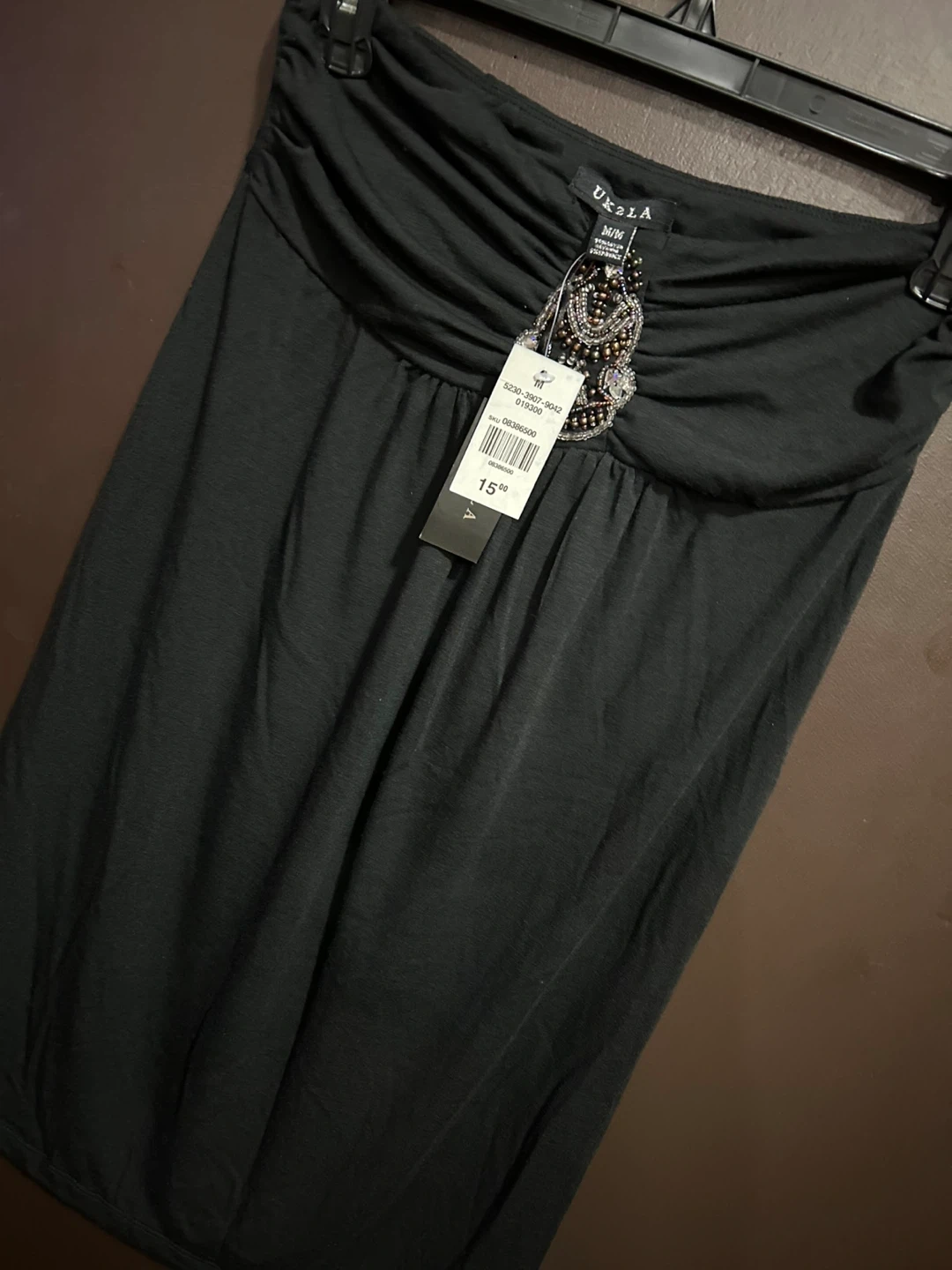 New Black strapless top from Ukzla. It features a ruched bust with beaded embellishment. Size M/M.