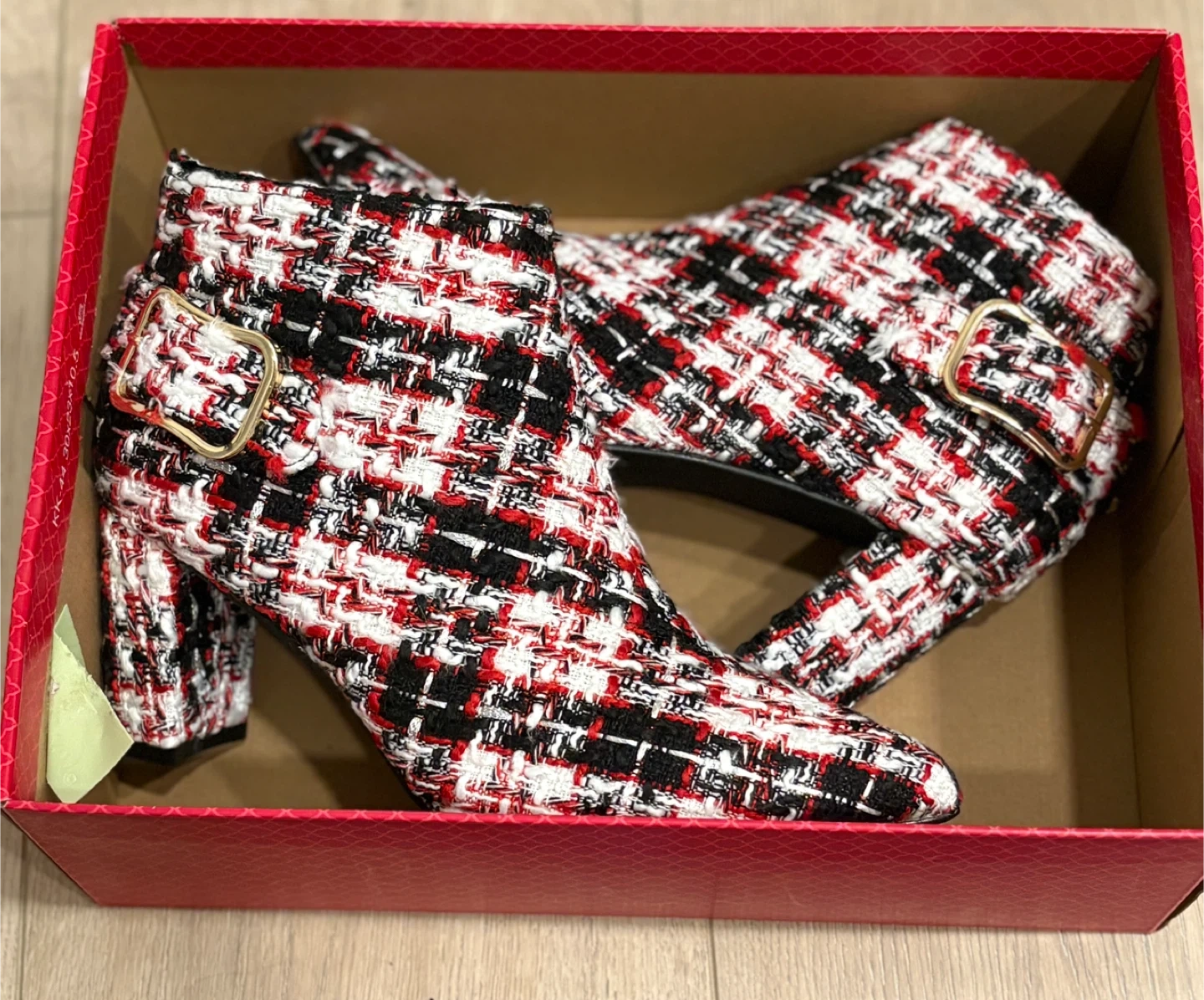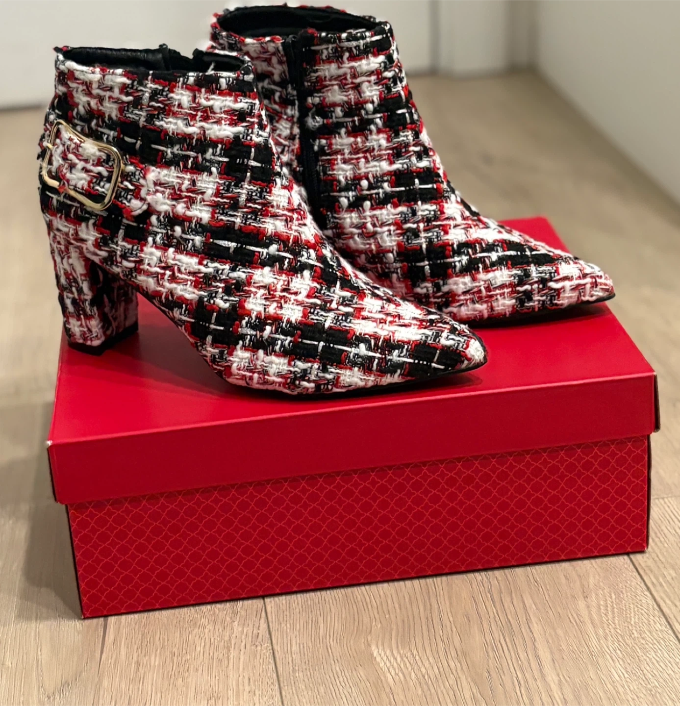 Stylish tweed ankle boots in a black, white, and red pattern. These boots feature a pointed toe, a side buckle accent, and a chunky block heel. They come in a US size 7. These boots would add a pop of pattern to any outfit!