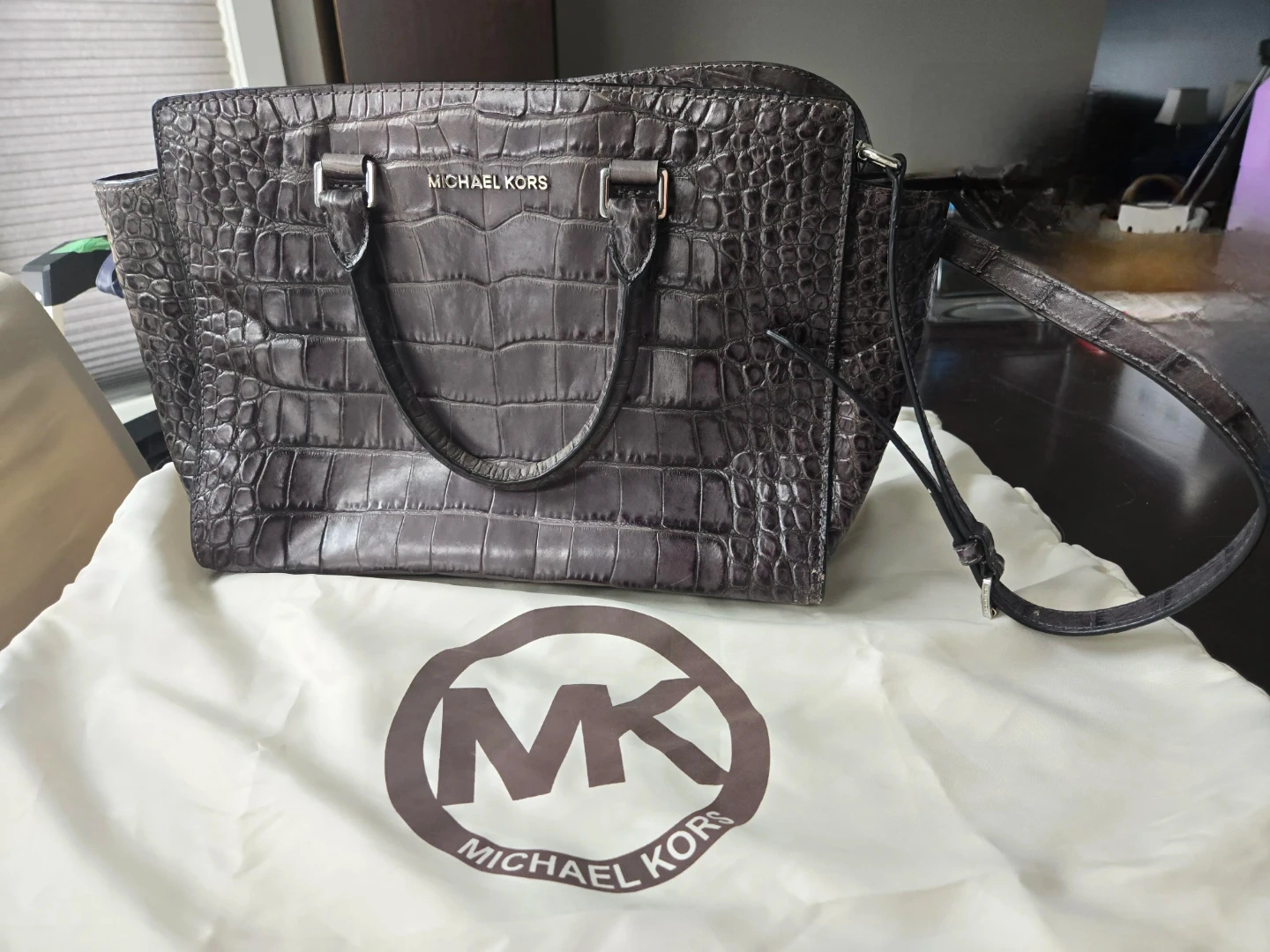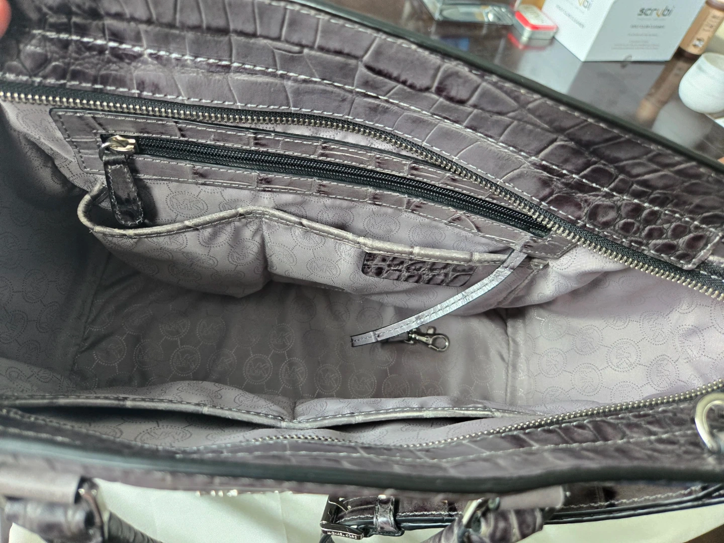 A stylish Michael Kors satchel tote in a dark grey colour with a crocodile embossed texture. It's made of leather and includes a dust bag for storage. Plenty of interior pockets to keep your essentials organized!