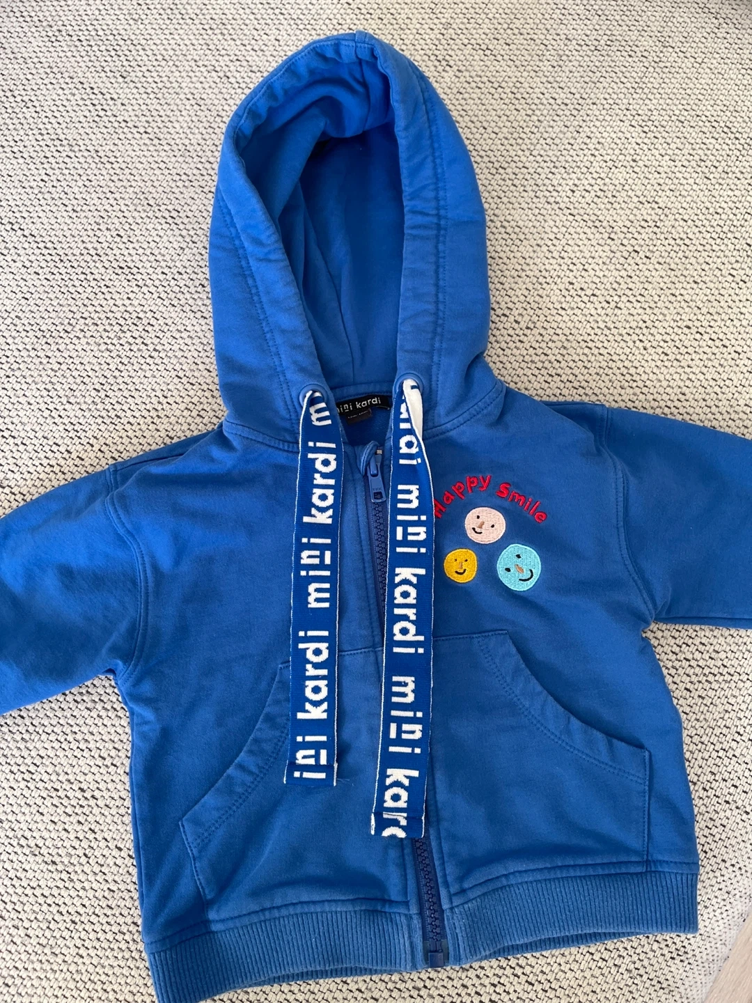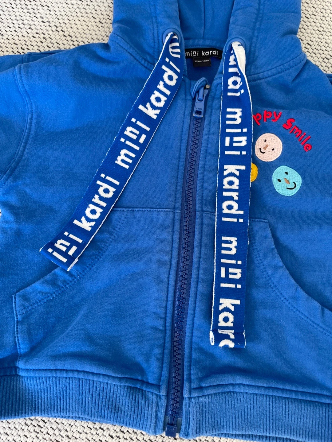 This is a cute blue zip-up hoodie from Mini Kardi featuring "Happy Smile" embroidery. It's made of soft cotton for comfort. This hoodie would be great for everyday wear for a little one!