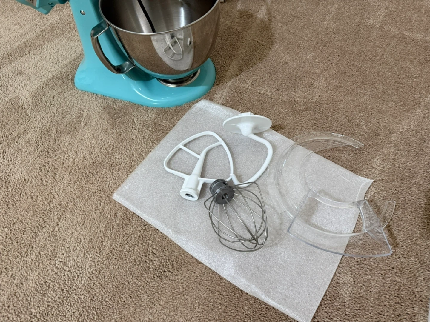 This KitchenAid Artisan stand mixer comes in a beautiful aqua sky color. It's a tilt-head model with a 5-quart stainless steel bowl. Includes dough hook, flat beater, and wire whip attachments. The original box is also present.