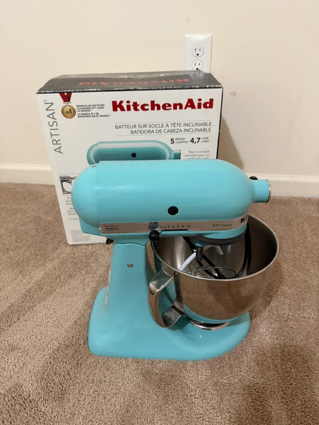 This KitchenAid Artisan stand mixer comes in a beautiful aqua sky color. It's a tilt-head model with a 5-quart stainless steel bowl. Includes dough hook, flat beater, and wire whip attachments. The original box is also present.