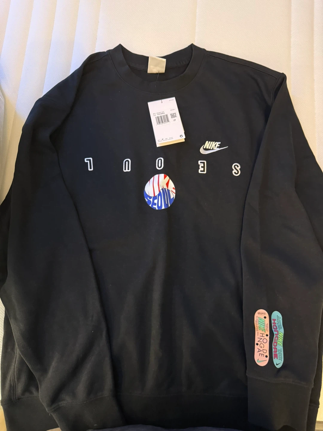 Selling a Nike 100ES crewneck sweatshirt in black. It's in new condition and ready for a new owner. The design features the Nike logo and custom unique graphic. Perfect for casual wear! Was made and brought from Korea and never worn.