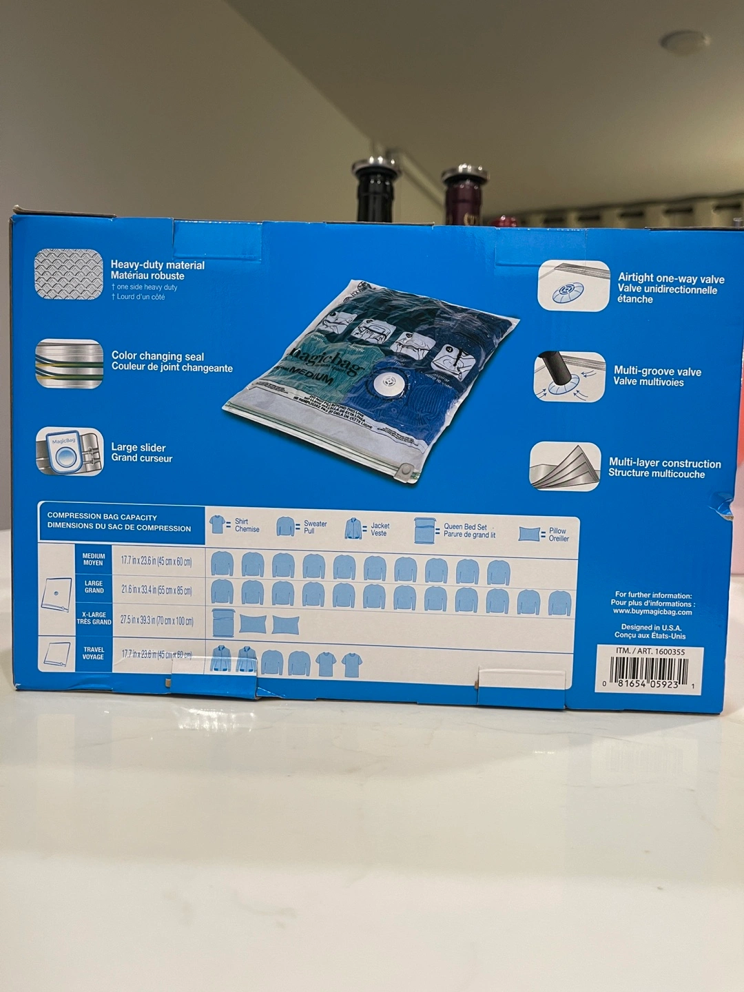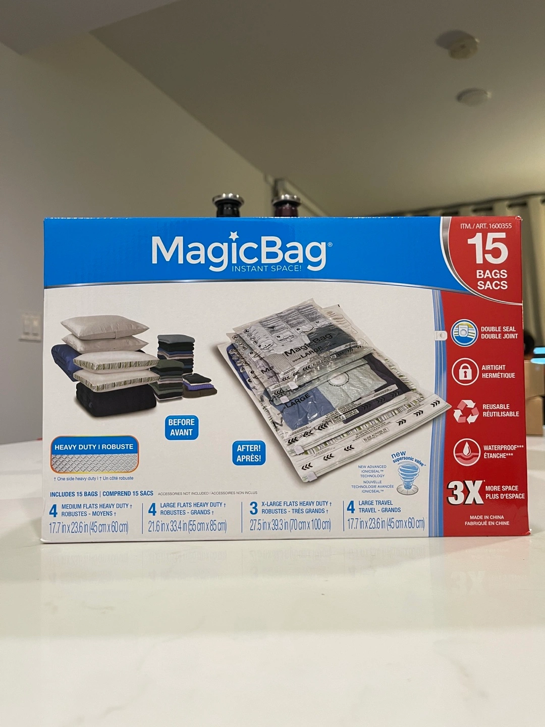 Set of 15 heavy-duty vacuum storage bags. Includes 4 medium, 4 large, 3 x-large, and 4 travel-sized bags. Airtight, reusable, and waterproof. Features a double seal and multi-groove valve. Great for storing clothing, bedding, and more.