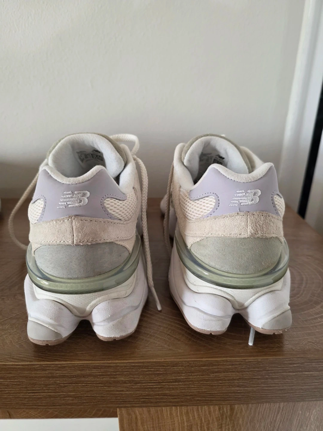 New Balance 9060 lifestyle sneakers in a light olive and cream colour.