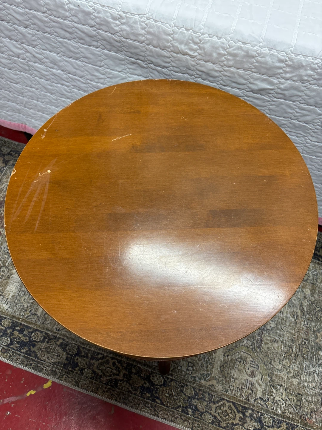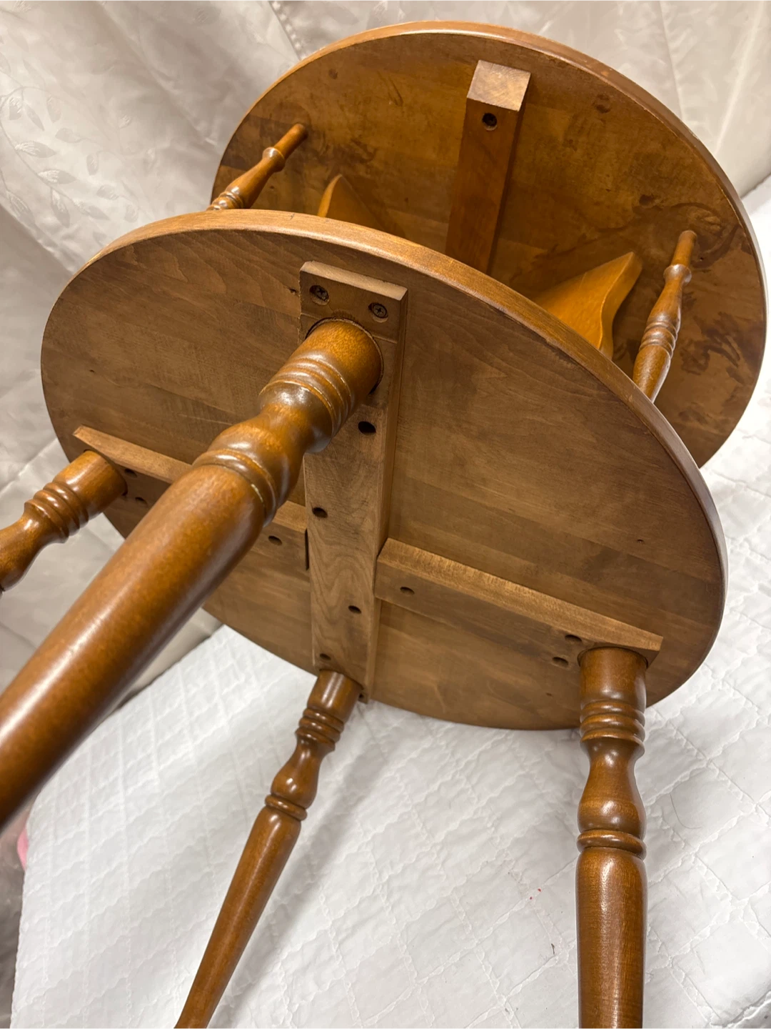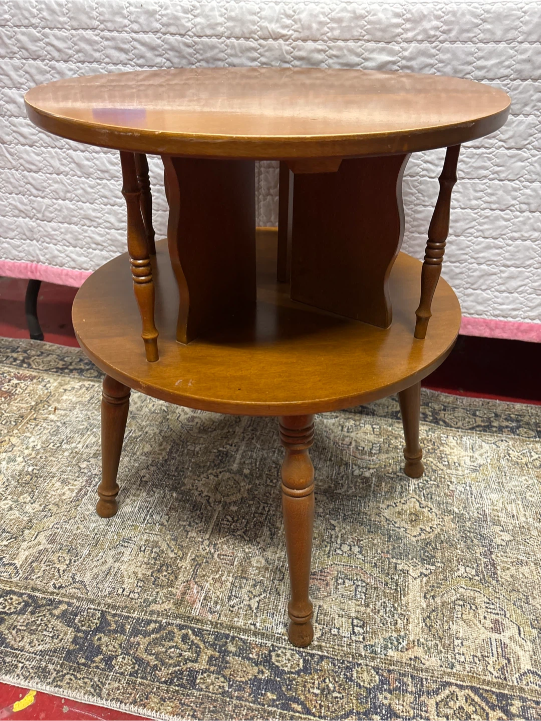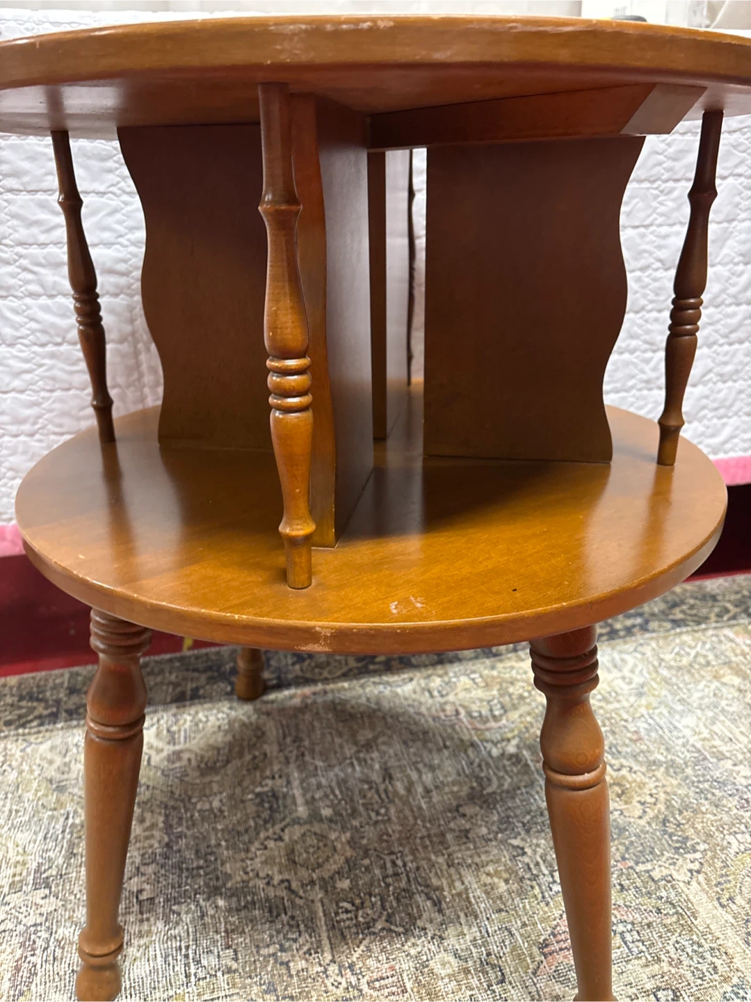 Selling a lovely wooden round accent table with two tiers! It's perfect for adding a touch of charm to any room. It has a classic design with spindle legs and a warm wood finish. It's in good condition and ready for a new home!