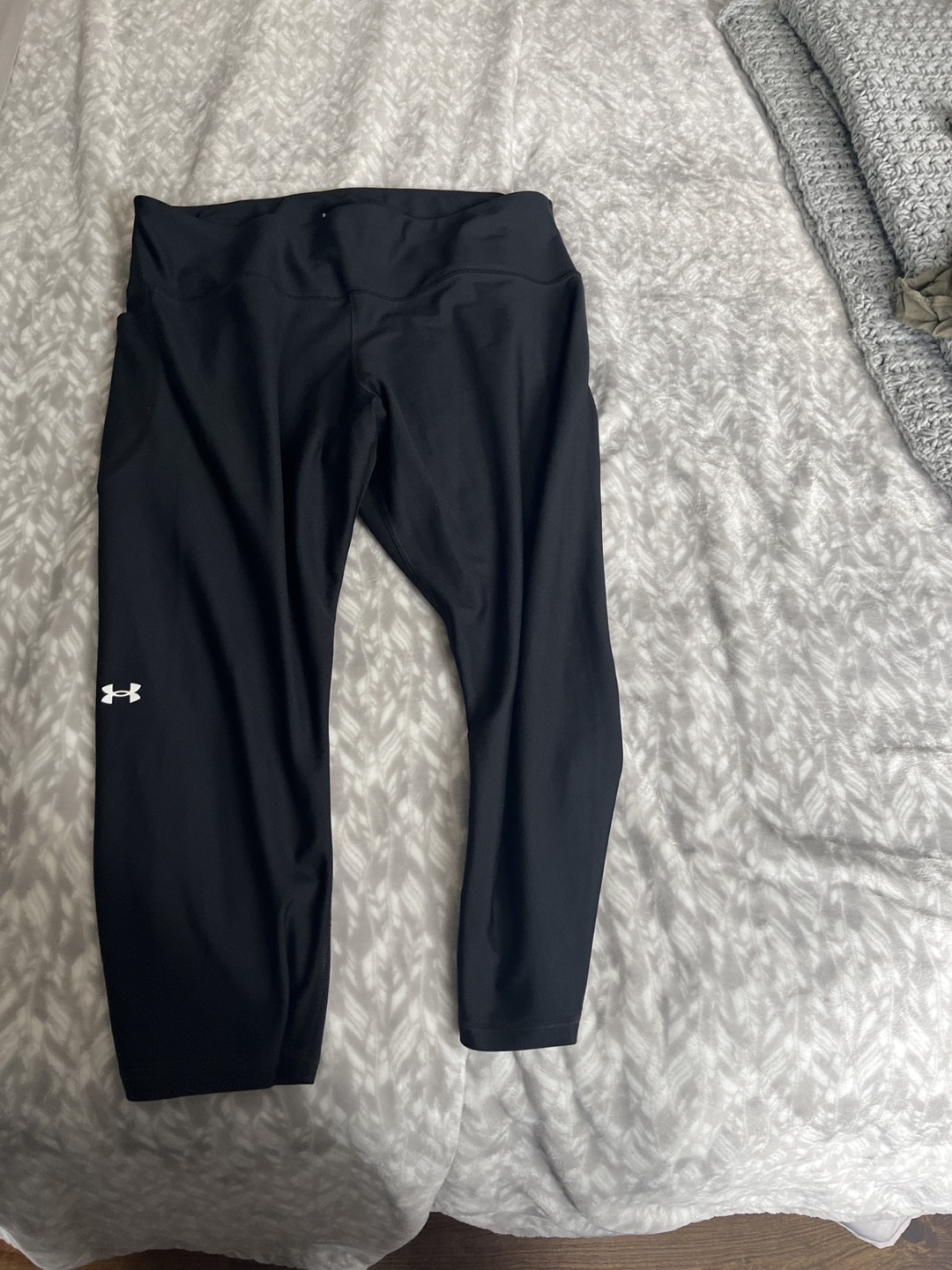 Women's black workout leggings. High-waisted design. Features side pockets. Excellent for exercise.capris