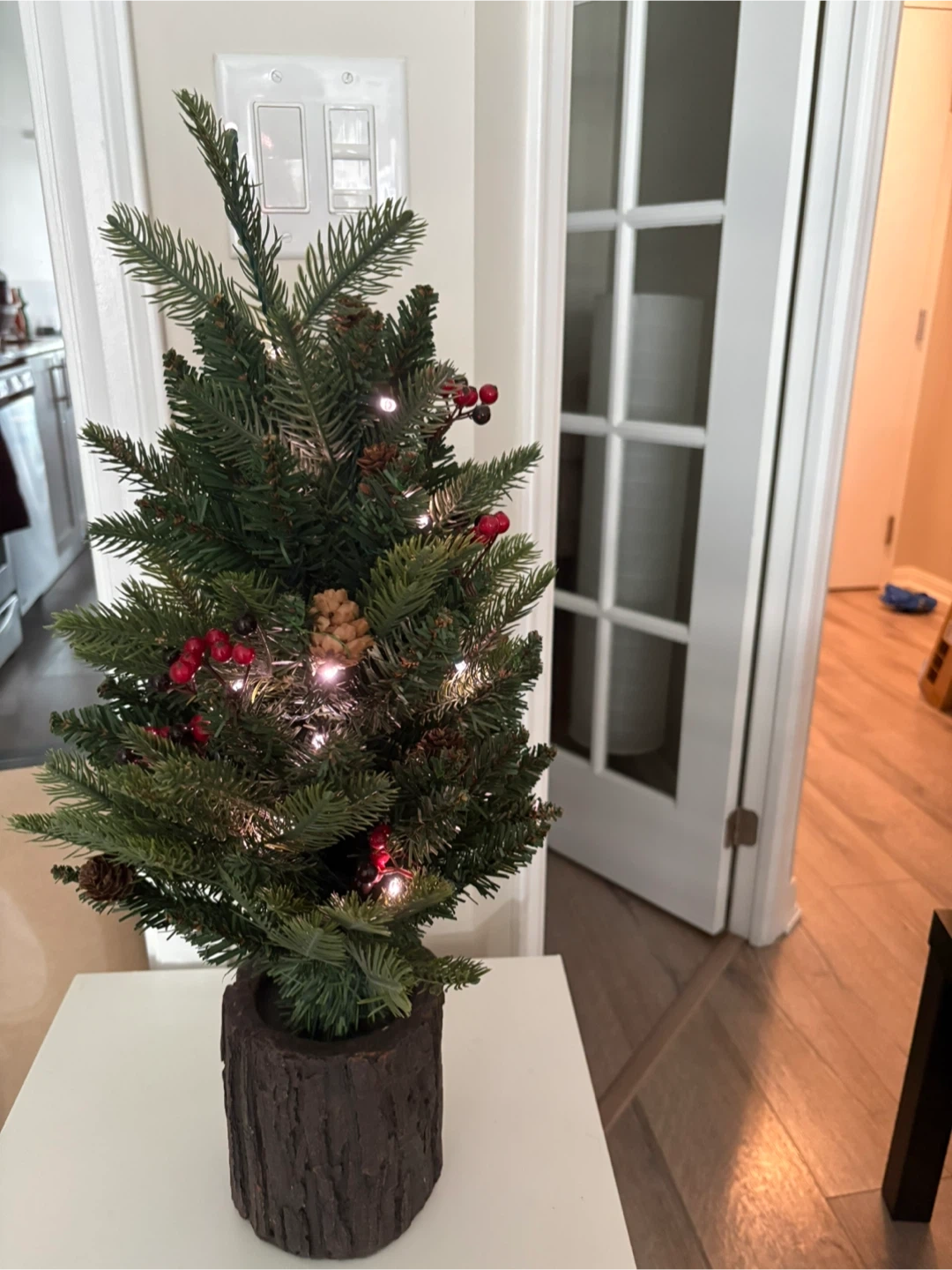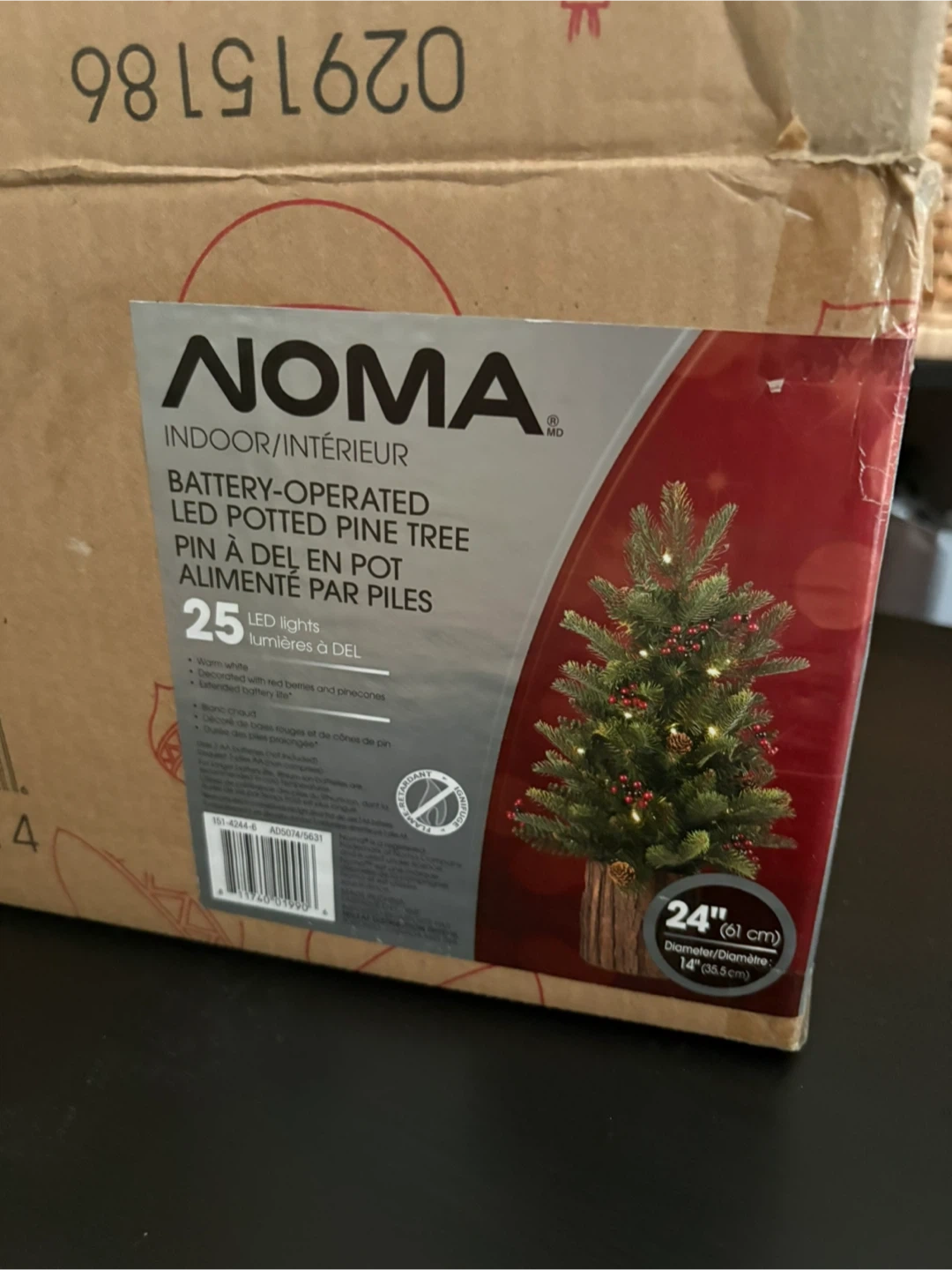 Selling a NOMA indoor battery-operated LED potted pine tree. It's 24 inches (61 cm) tall and the diameter is 14 inches (35.5 cm). It has 25 LED lights and is decorated with red berries and pinecones. It uses 3 AA batteries (not included).