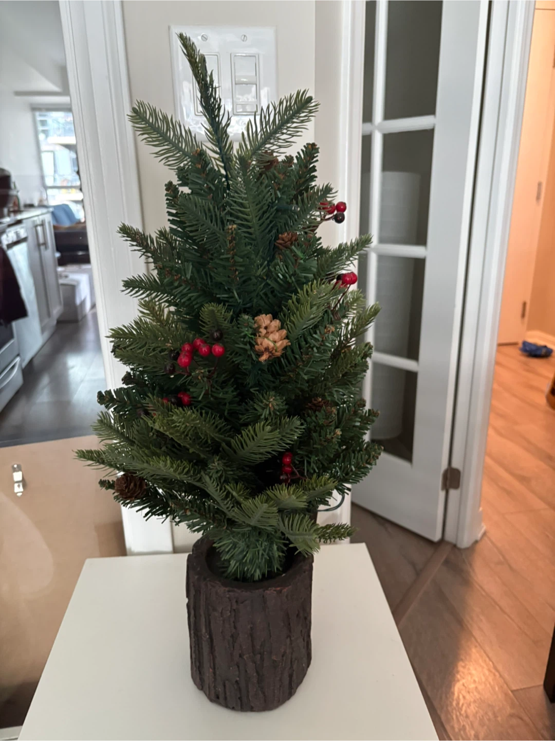 Selling a NOMA indoor battery-operated LED potted pine tree. It's 24 inches (61 cm) tall and the diameter is 14 inches (35.5 cm). It has 25 LED lights and is decorated with red berries and pinecones. It uses 3 AA batteries (not included).