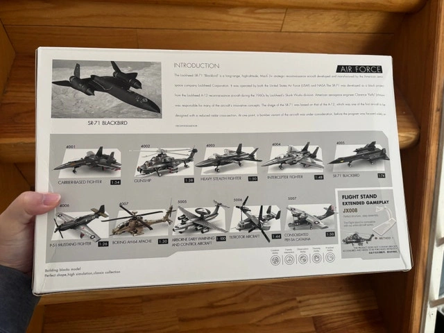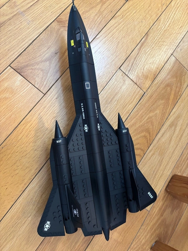 Lego Compatible Large SR-71 Black Bird model building block set. Brand new, sealed in original box. 183 pieces. Dimensions: 43.8cm x 22.7cm x 9.6cm. Excellent design and quality fit. Photos 4-6 show the one I built. Photos 7-8 show it after a matte clear coat for a more realistic finish. Cash only. If the ad is up, it's still available. Check out my other listings for other military building block models for sale.