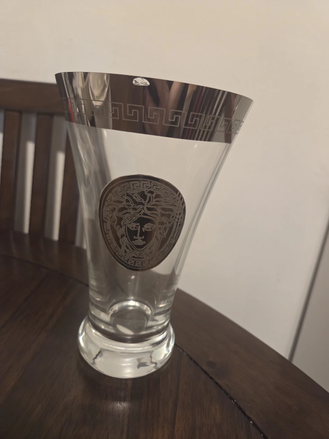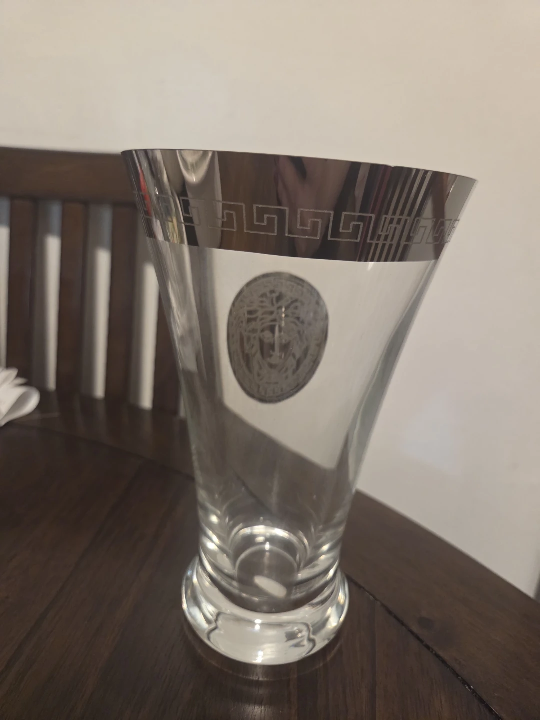 This is a crystal vase featuring the iconic Versace Medusa head and Greek key pattern. It's made of clear glass with silver-tone accents. This vase adds a touch of luxury to any home decor.