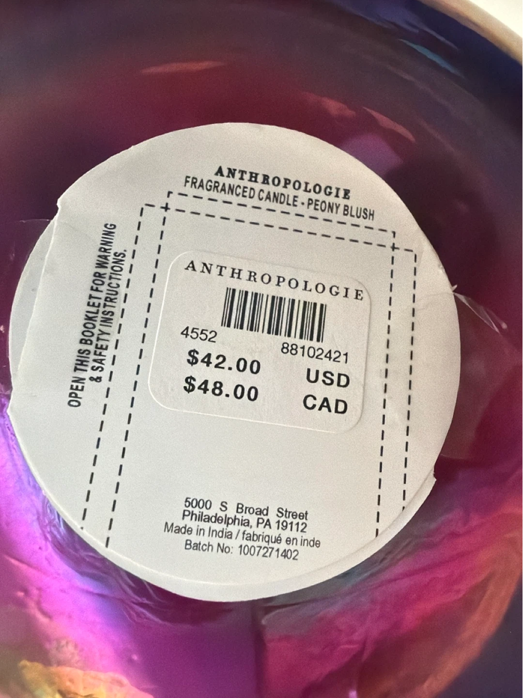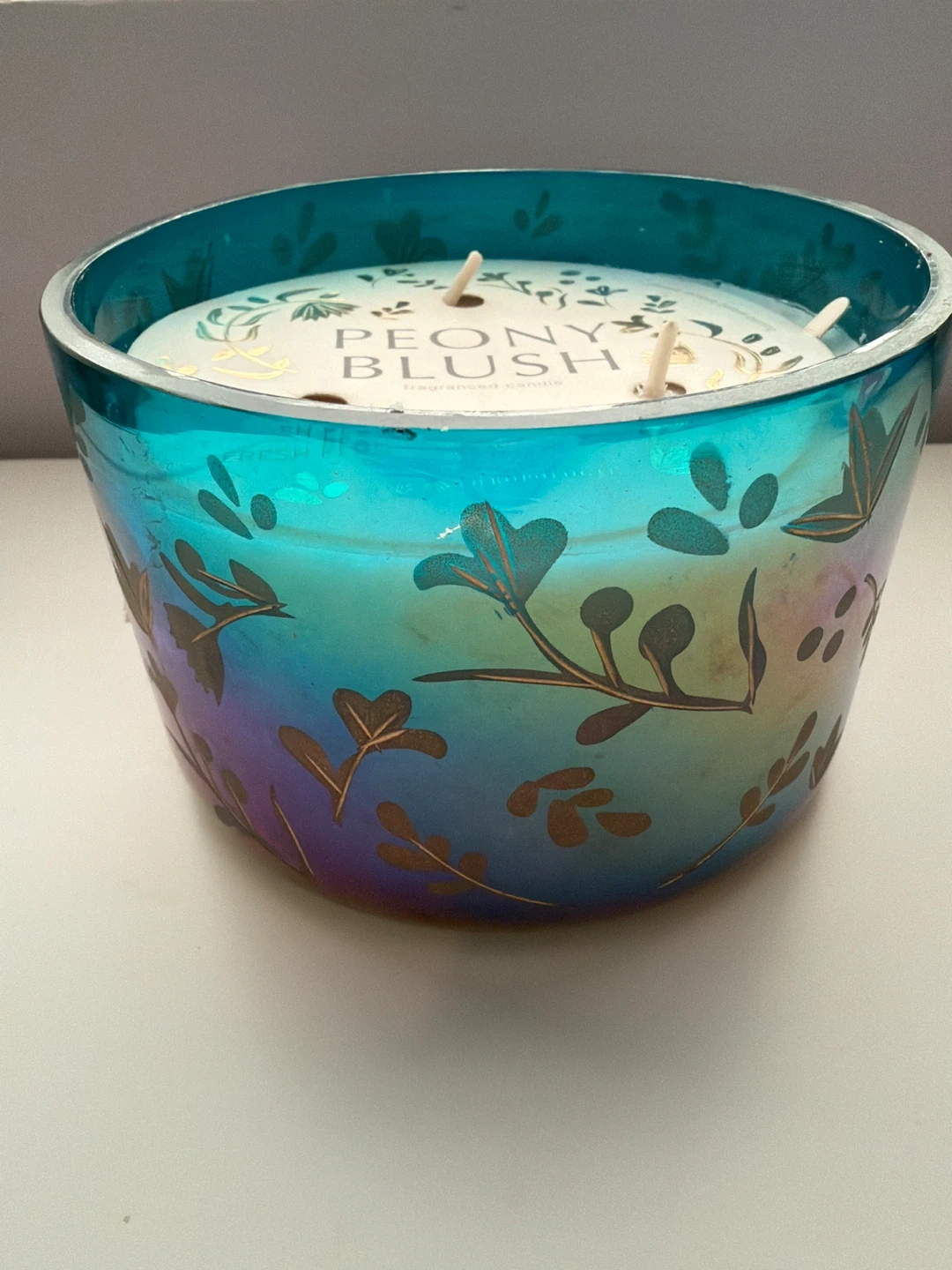 This Anthropologie "Peony Blush" scented candle features a multi-hued glass jar with a botanical design. It's a three-wick candle with notes of lemon & blackcurrant, fresh peony & rose, vetiver & amber. The jar has a colourful iridescent finish.
