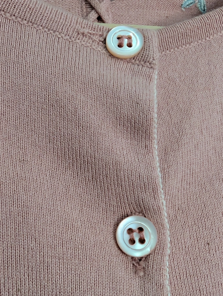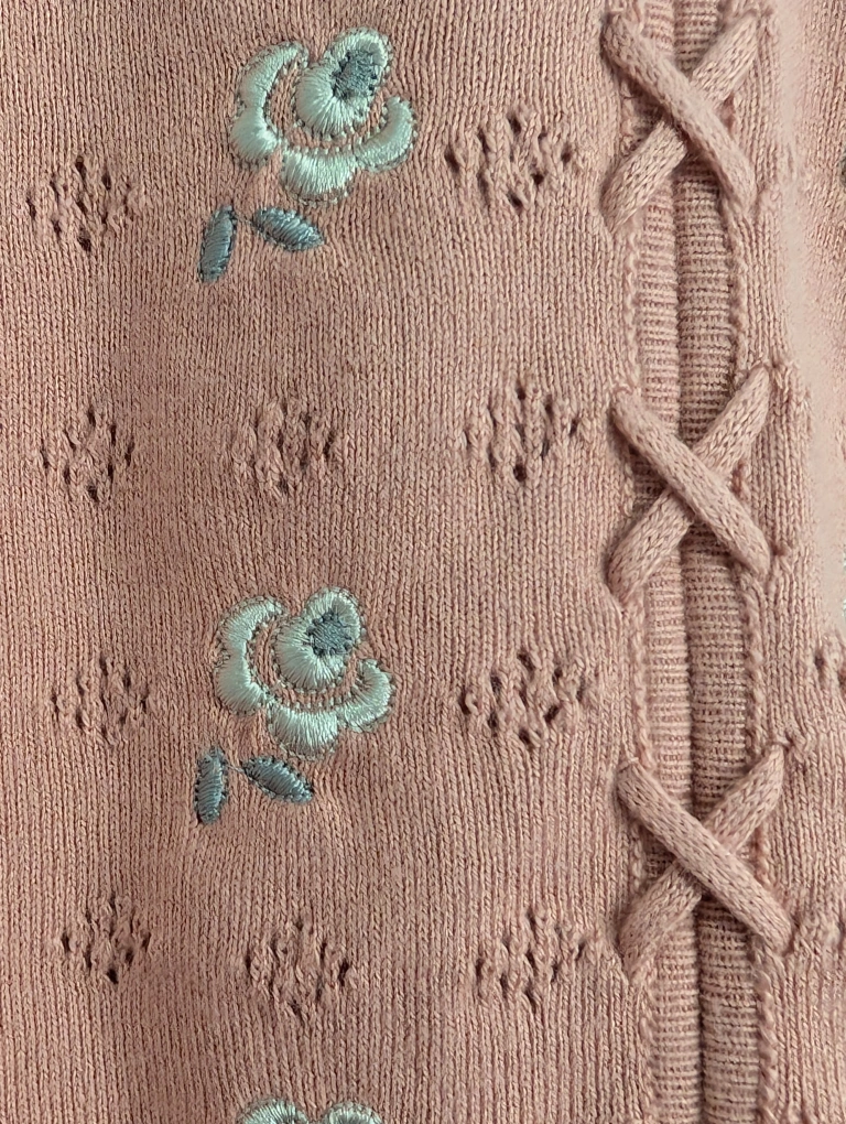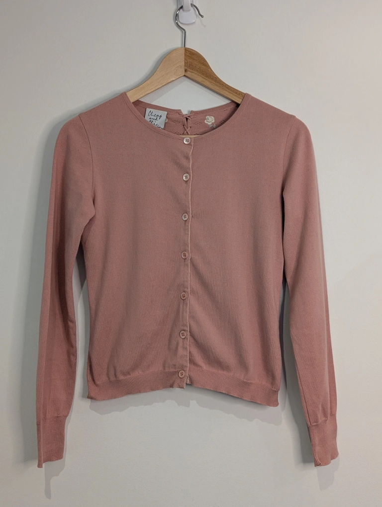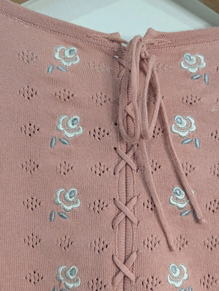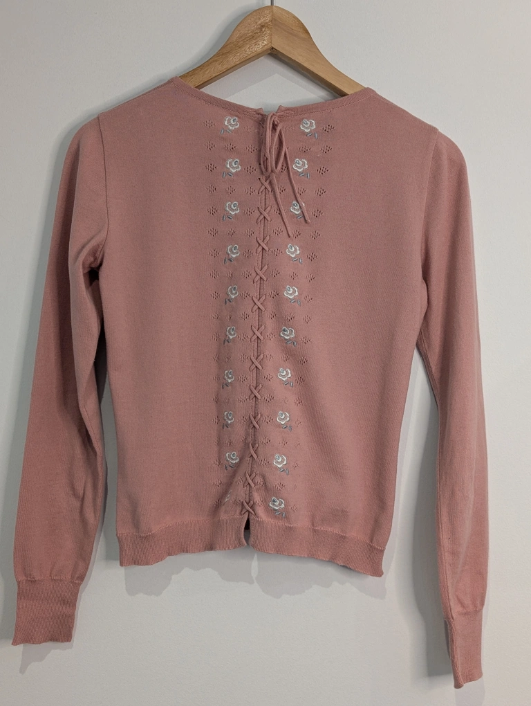 Dusty rose cardigan. Size 4. Button front. Lace-up back with embroidered floral detail. Long sleeves. Ribbed cuffs and hem.