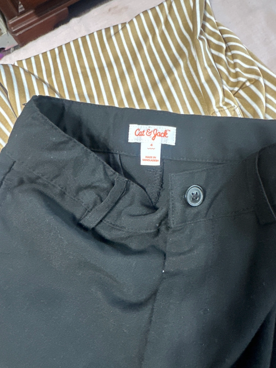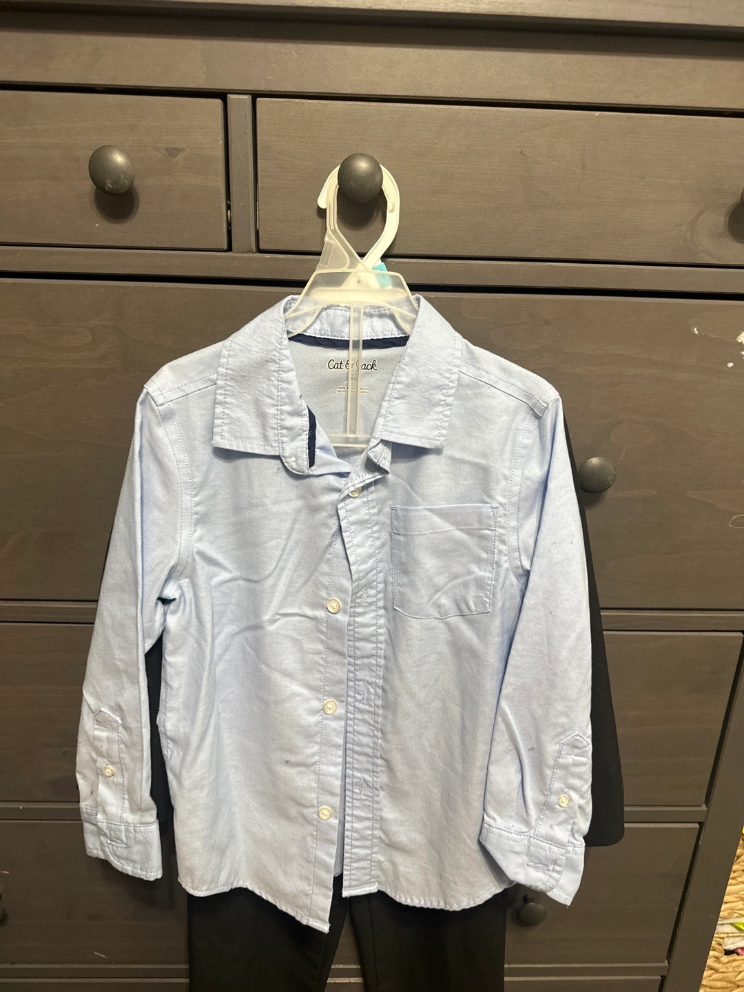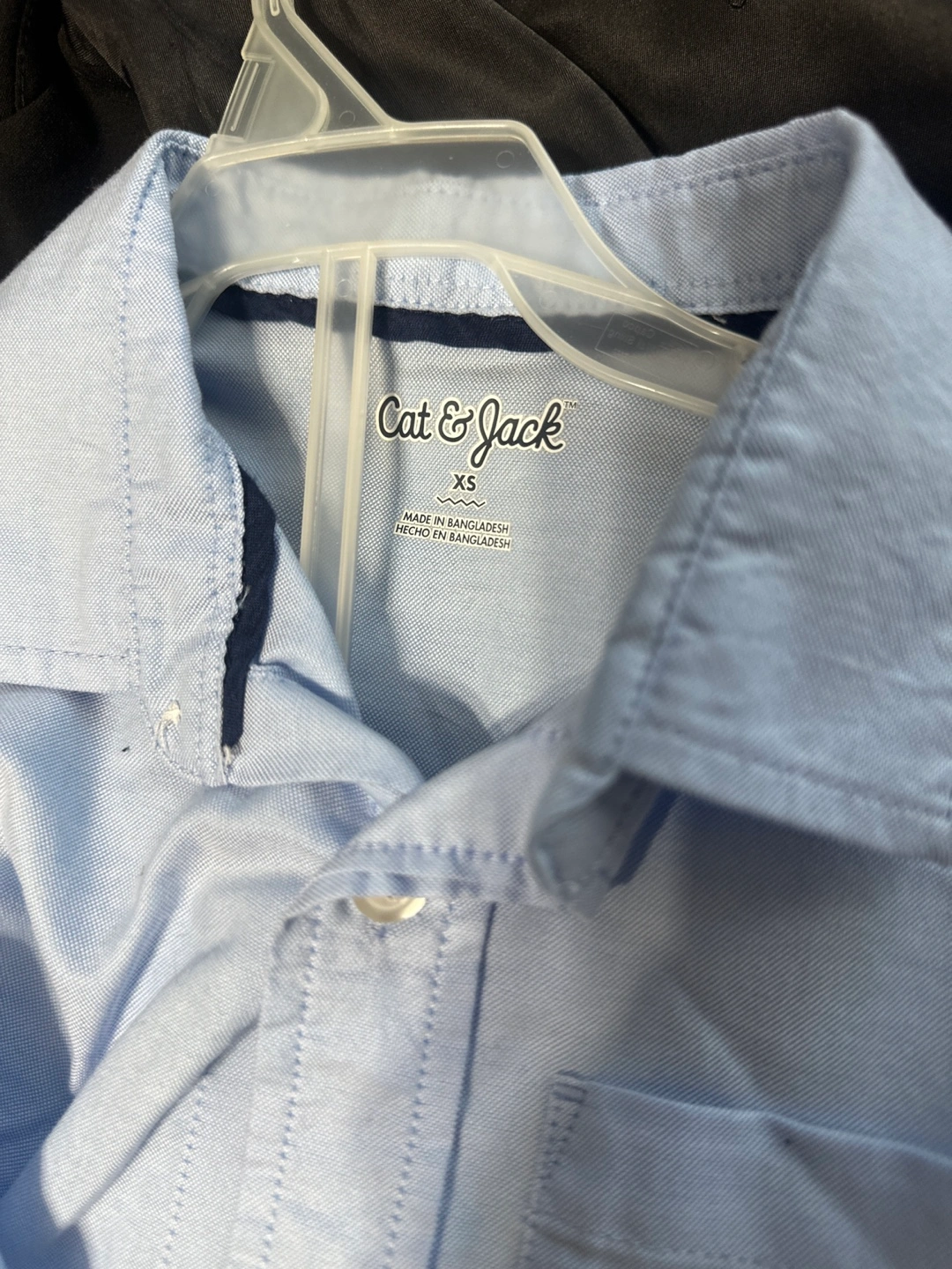 I'm selling a cute Cat & Jack light blue button-down shirt in size XS. It's paired with a Calvin Klein black suit, size 4. Both are in great condition and ready for a new home! 3 pieces