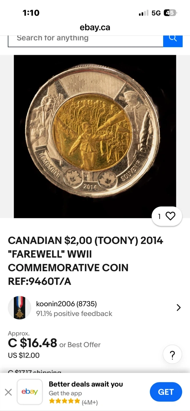 Canadian $2 "Toony" 2014 Farewell WWII Commemorative Coin