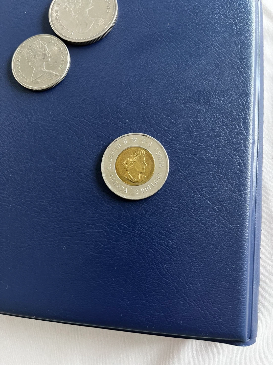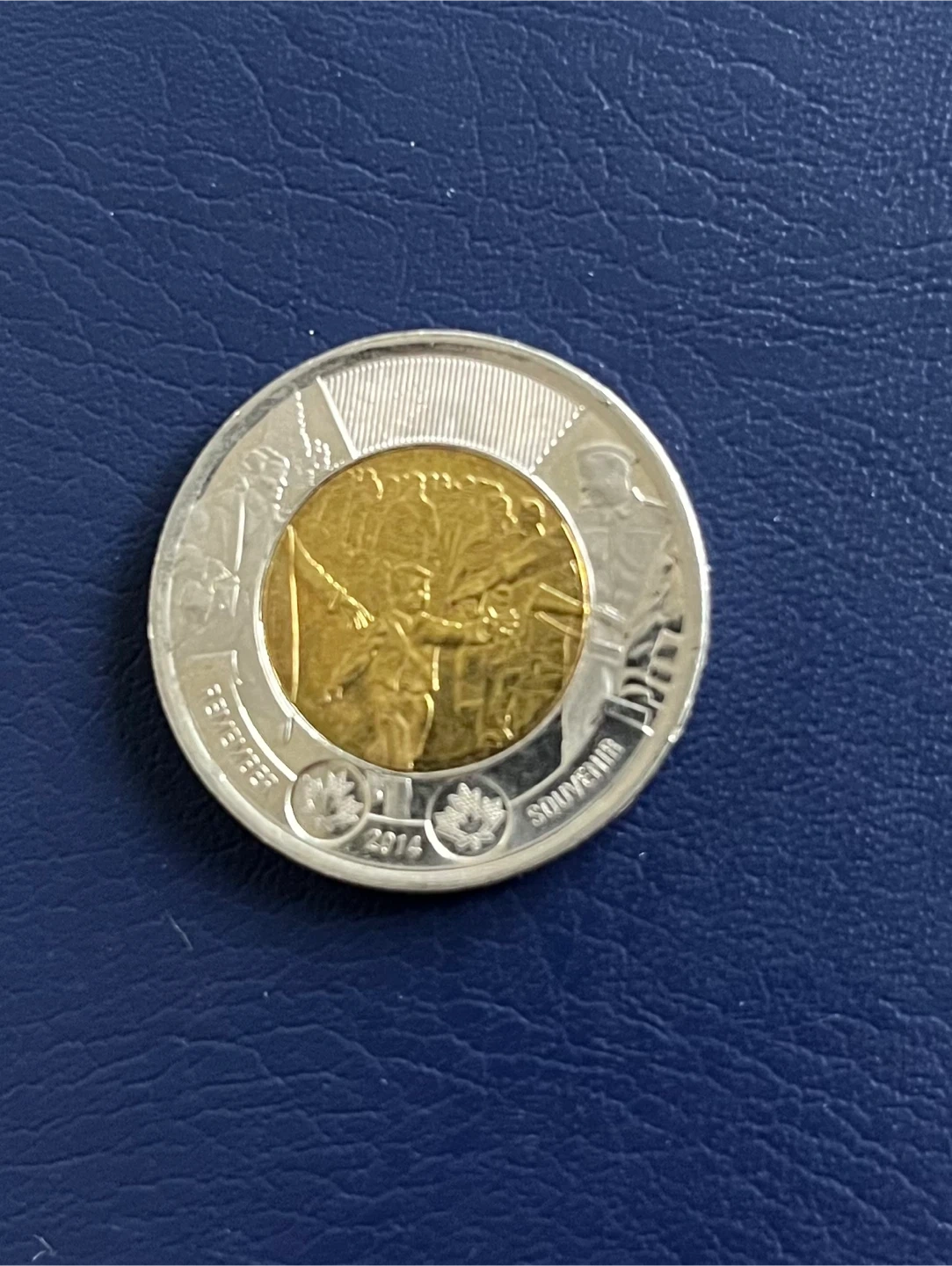 This is a Canadian $2 coin from 2014 commemorating the "Farewell WWII". It features a bimetallic design with the effigy of Queen Elizabeth II on one side and a scene related to the war's end on the other. The coin's edge has the inscription "REMEMBER" and "SOUVENIR".