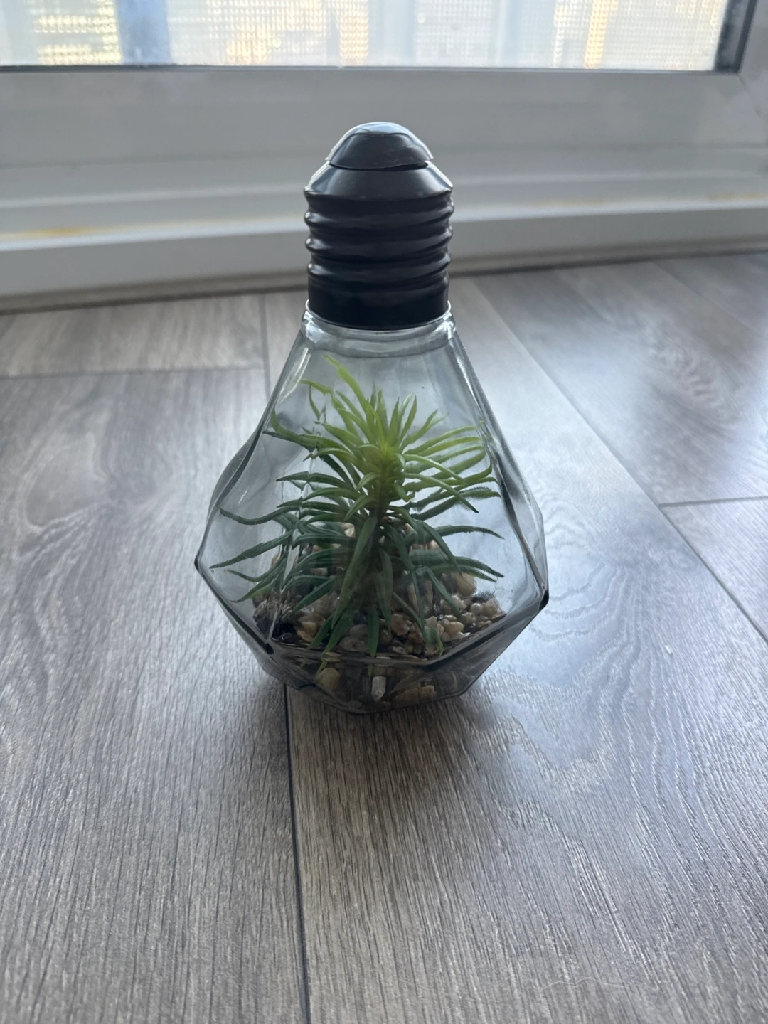 Unique glass terrarium shaped like a lightbulb. Contains a small succulent plant and decorative stones. Modern and stylish decor piece.