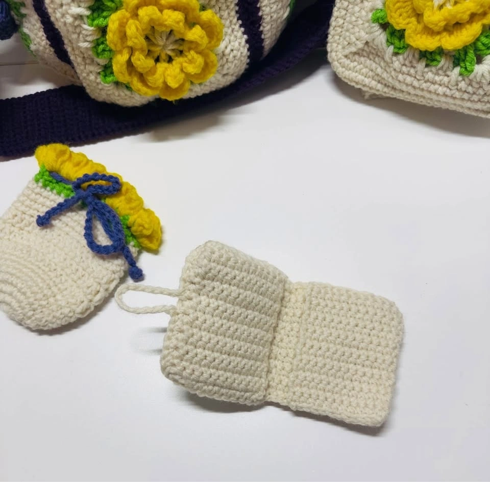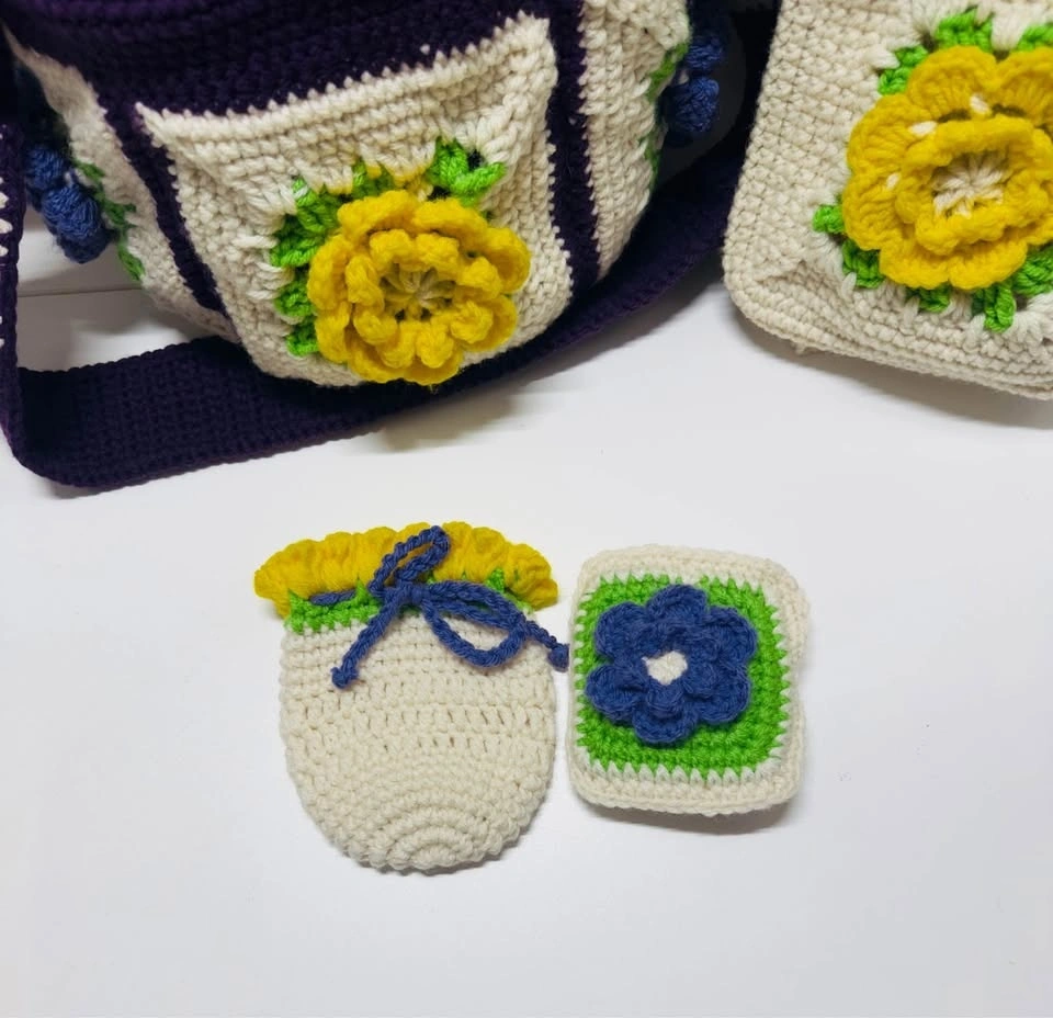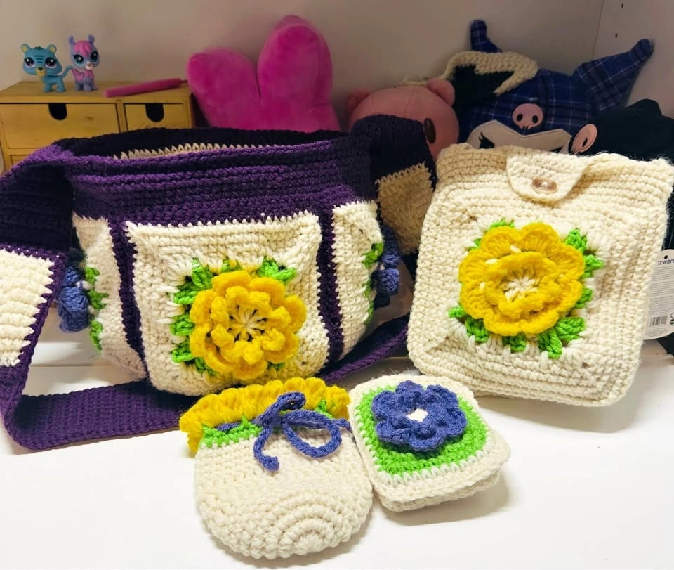 Handmade crochet purse set, featuring a spacious shoulder bag with a secure pull-string closure, a smaller purse with a sleek button closure, and a matching wallet and coin pouch with a convenient pull-string closure.