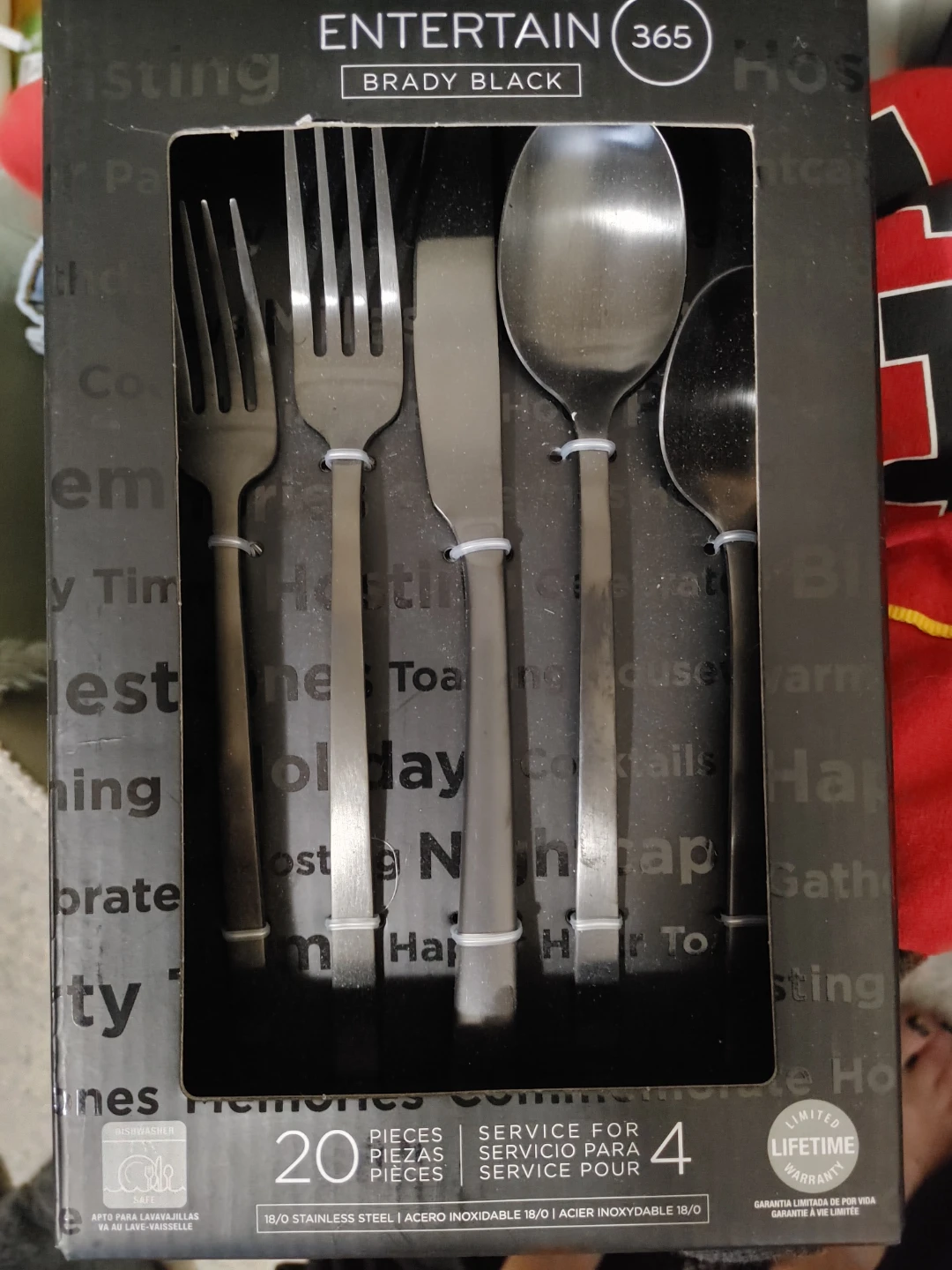 This Entertain 365 cutlery set comes in a Brady Black finish. It's made from 18/0 stainless steel and serves 4 people with 20 pieces. It's also dishwasher safe!