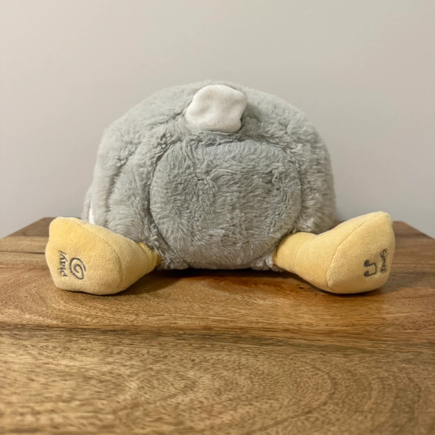 Squeeze one foot to sing and the other to play. Requires 3 AAA batteries.