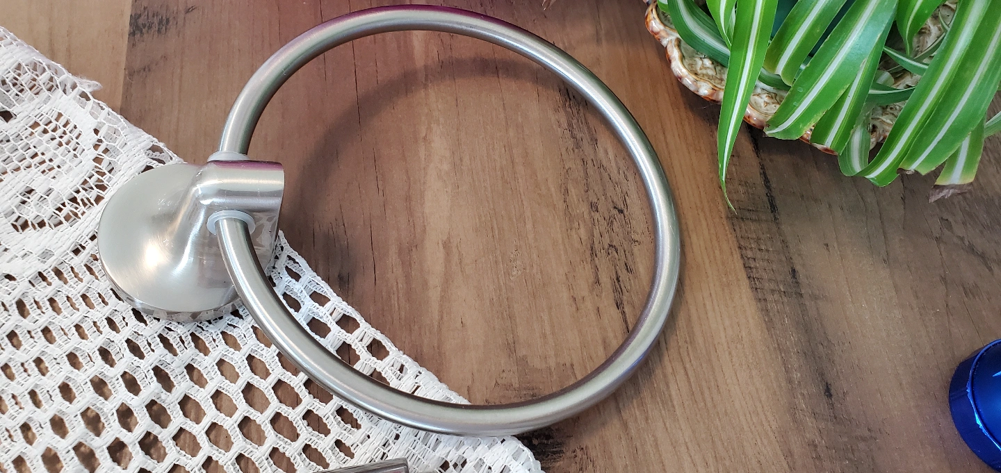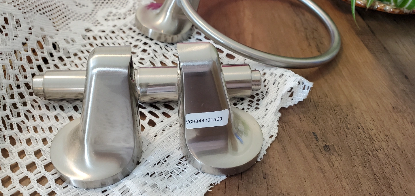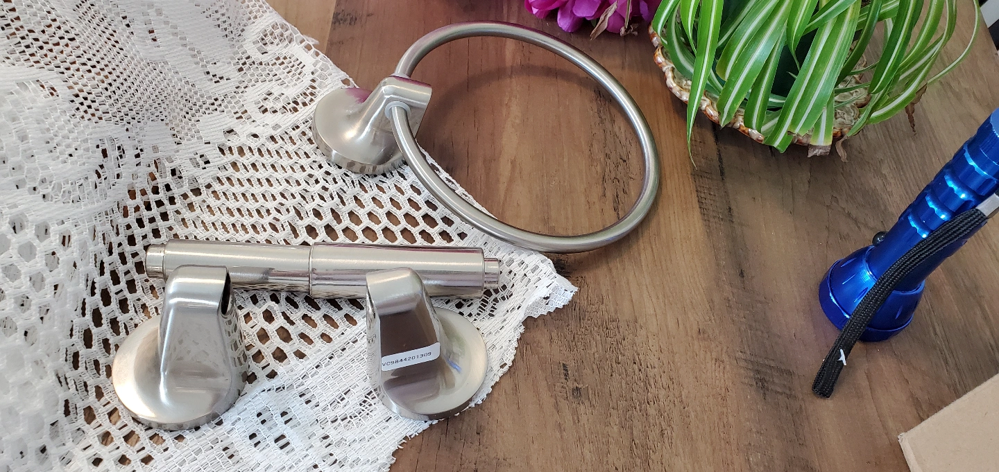 A bathroom hardware set. Includes a towel ring and a toilet paper holder, plus a matching accessory, all in a brushed nickel finish. Think of the tranquil feeling this hardware can provide to your bathroom experience.
