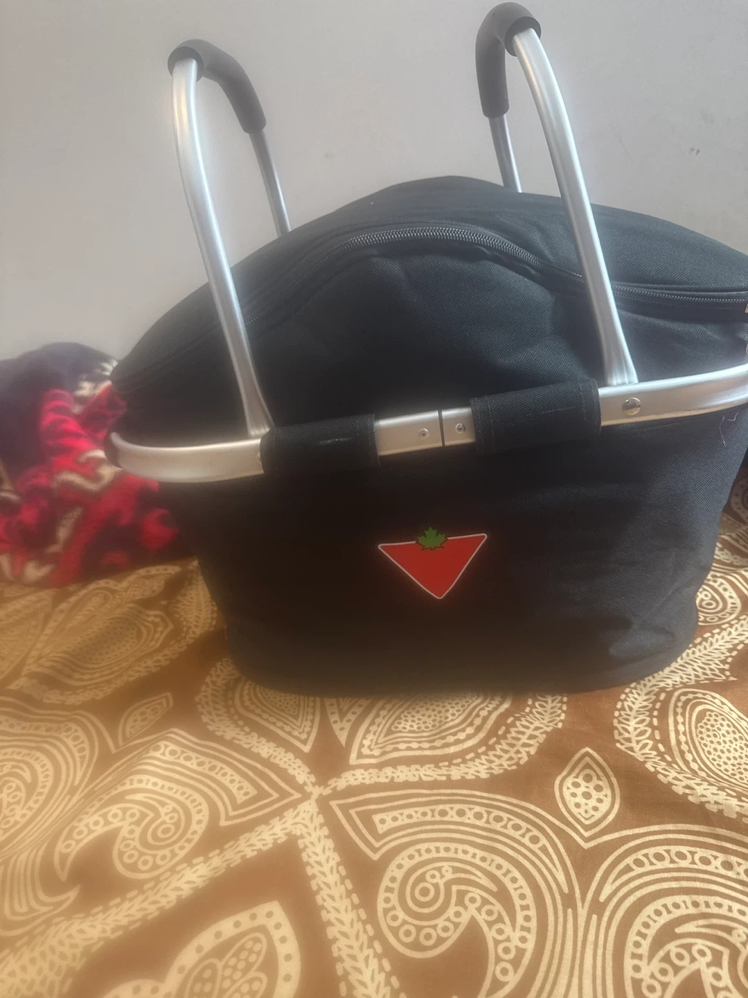 Black insulated picnic basket with aluminum frame and handles. It has a zippered top closure and a red triangular logo with a maple leaf. The interior is lined and spacious, suitable for keeping food and drinks cool.