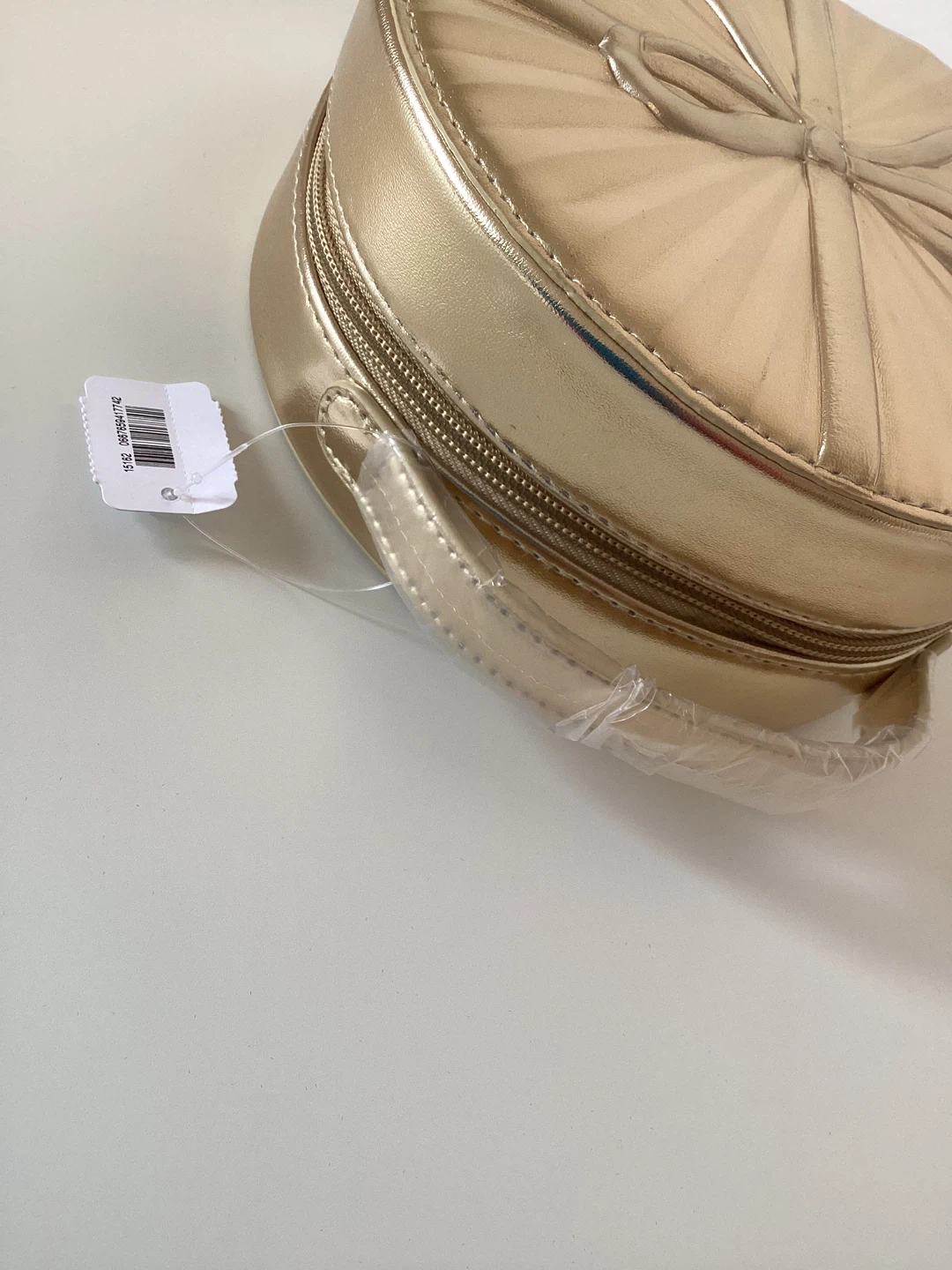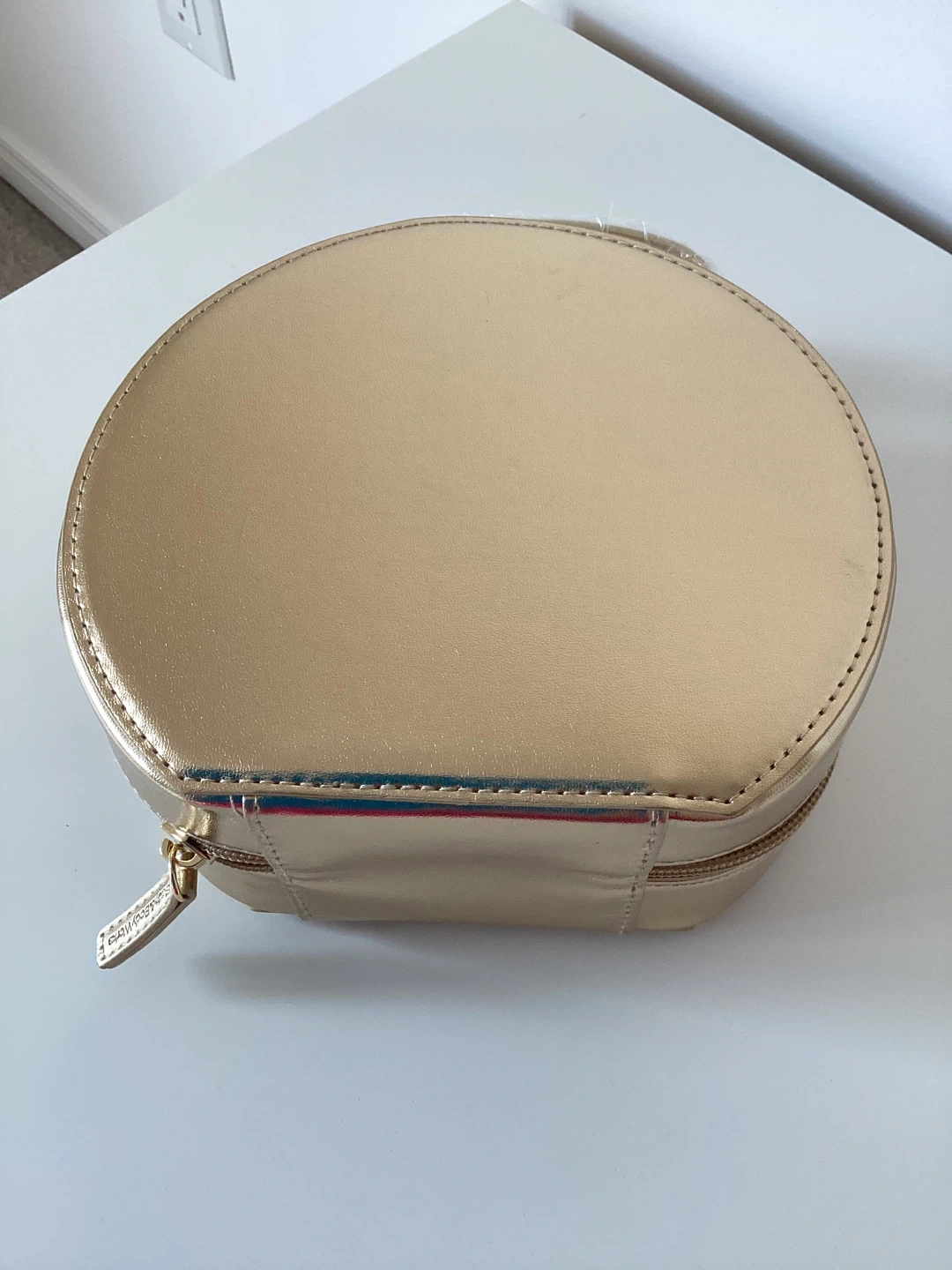 This gold train case is perfect for organizing makeup and accessories. It's a round, compact design with a built-in mirror inside. The case is made of a shiny, faux-leather material. It's ideal for travel or everyday storage!