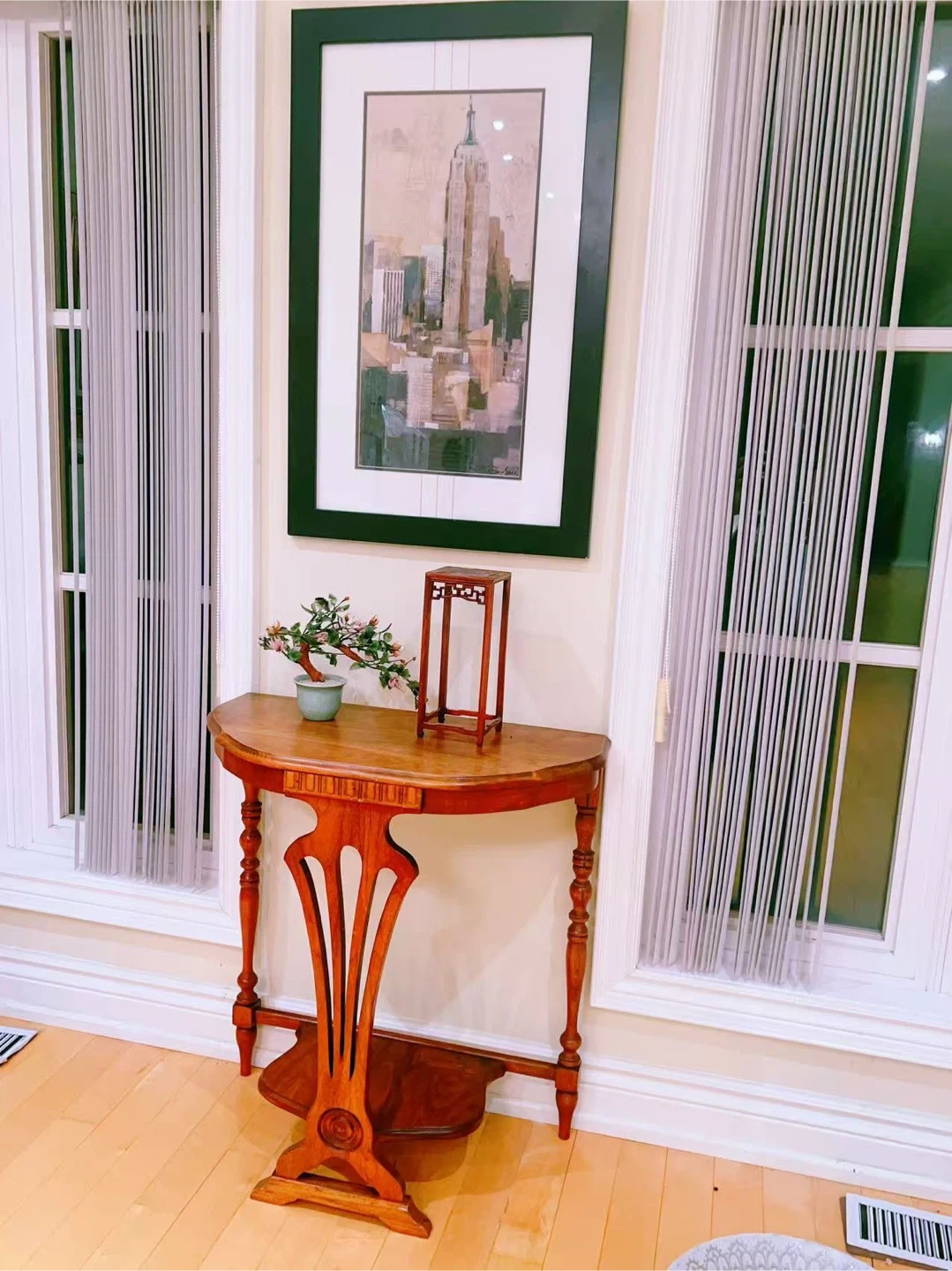 Selling a lovely wooden half-moon console table. It's a beautiful piece of furniture that would look great in an entryway or living room. The table features a unique design with elegant legs and a lower shelf for storage or display. It's in great condition and ready to find a new home!