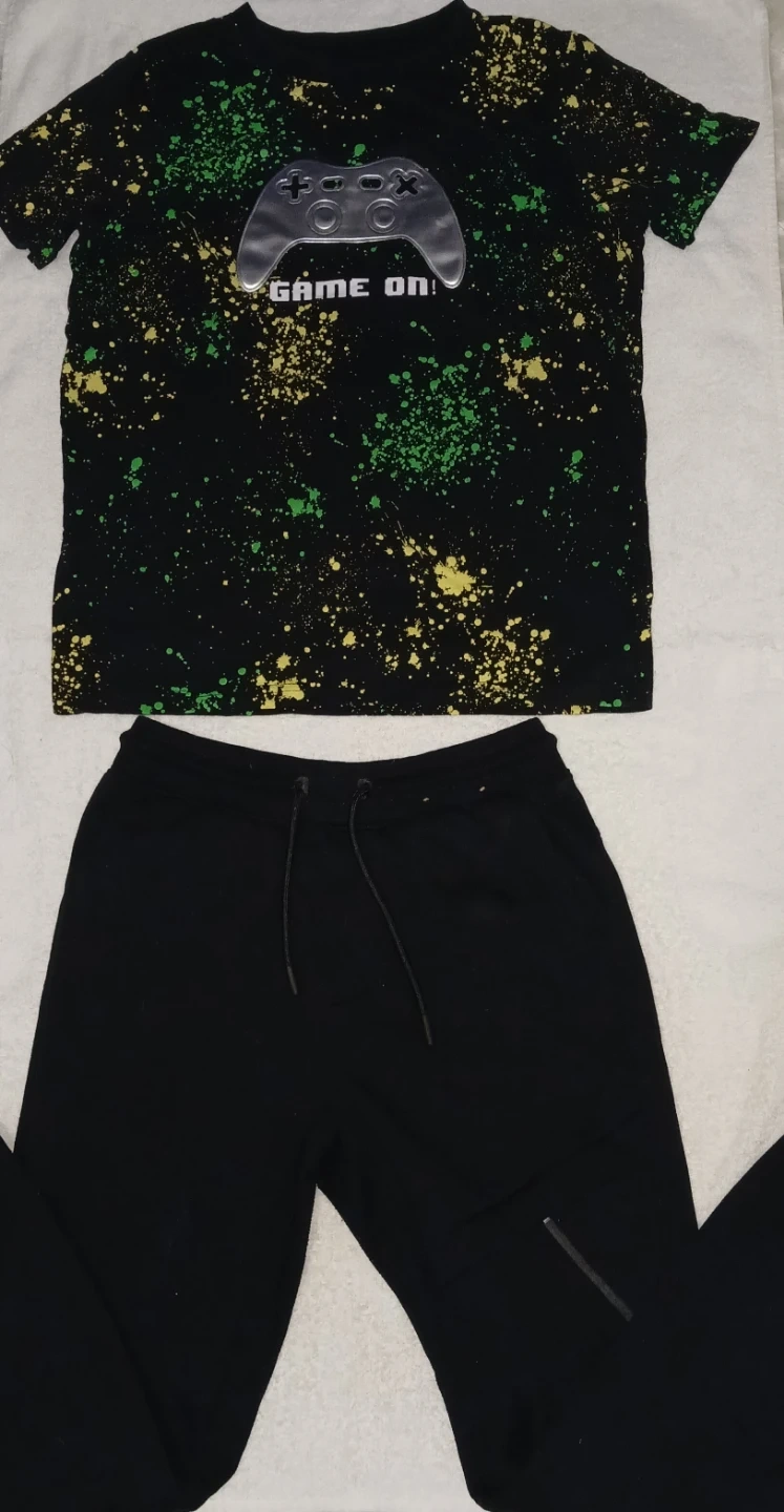 Selling a boys' T-shirt with a 'Game On' controller design and a pair of black joggers. Both items are in good condition and ready for a new gamer!