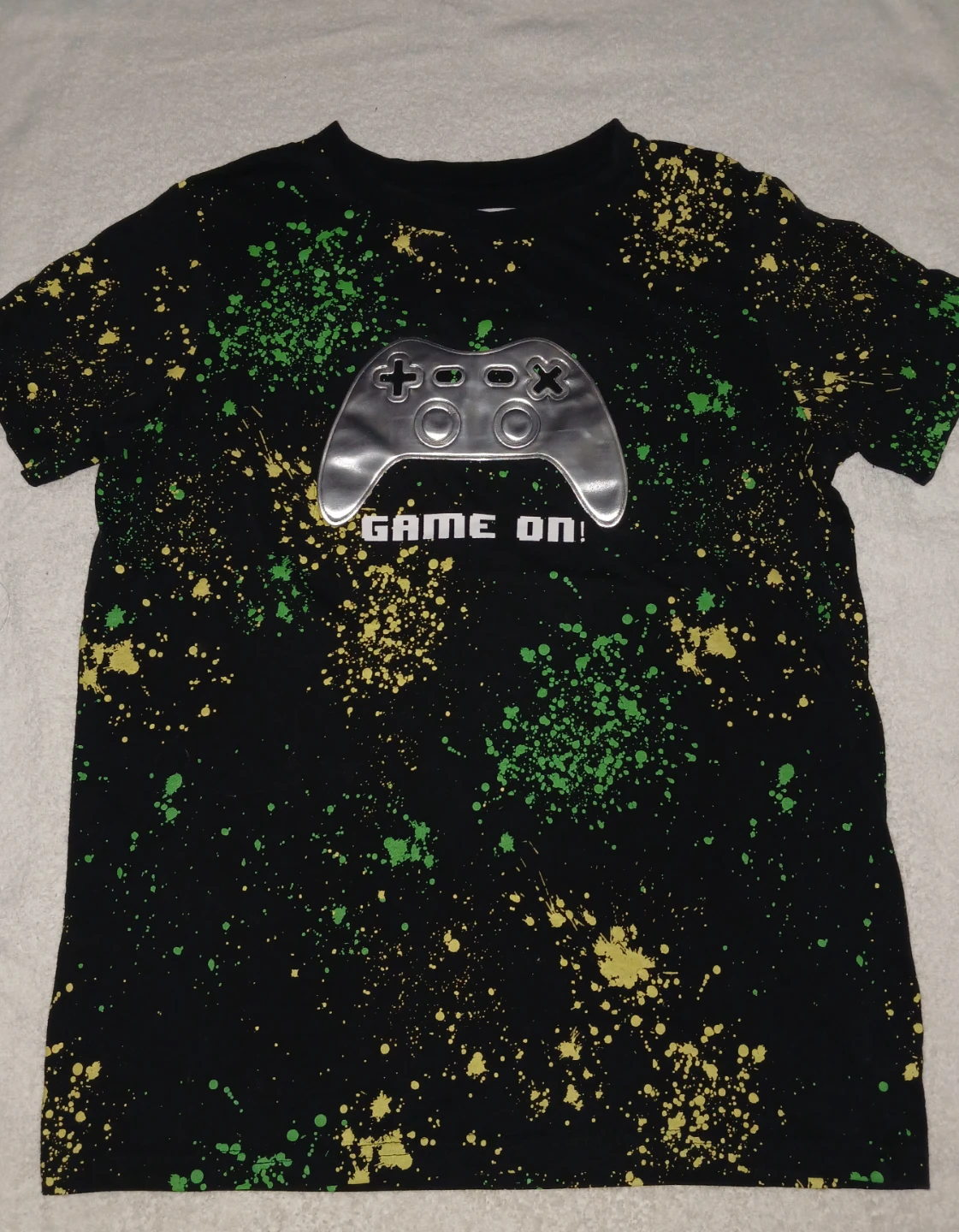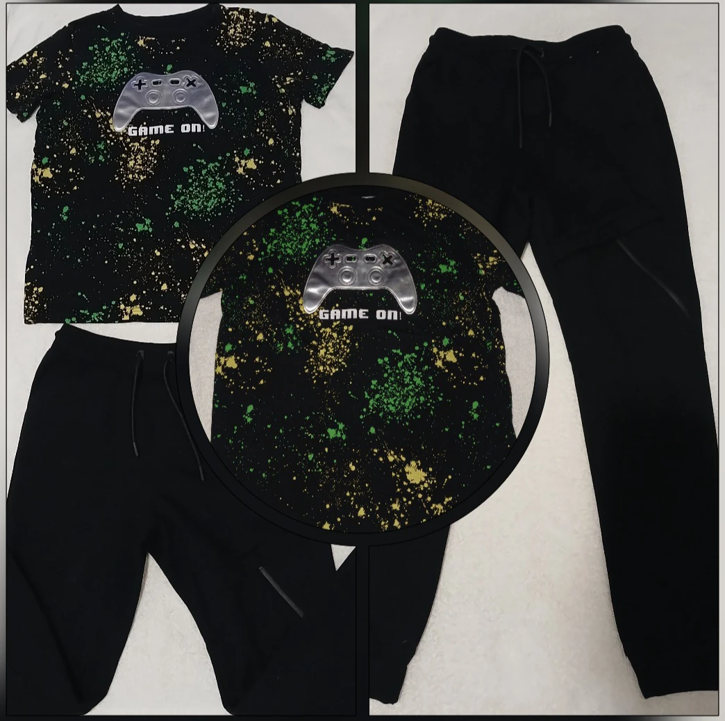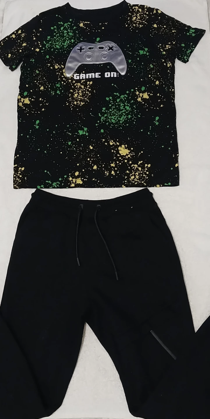 Selling a boys' T-shirt with a 'Game On' controller design and a pair of black joggers. Both items are in good condition and ready for a new gamer!