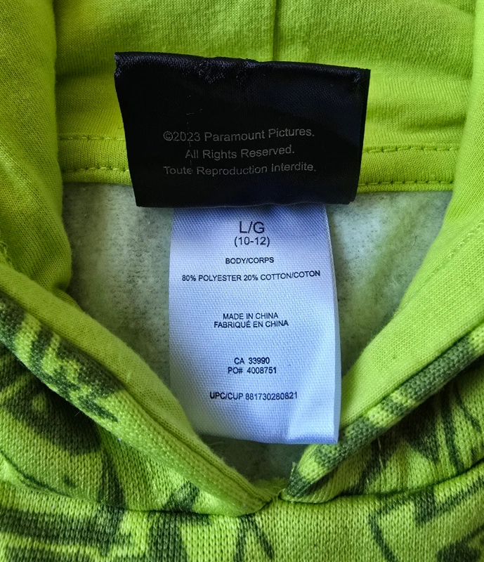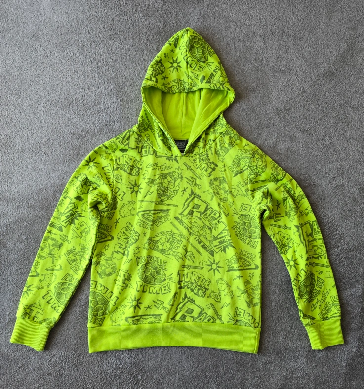 Here's a bright green Teenage Mutant Ninja Turtles hoodie! It's a size large (10-12) and made of 80% polyester and 20% cotton. The hoodie features a fun all-over print with TMNT characters and designs.