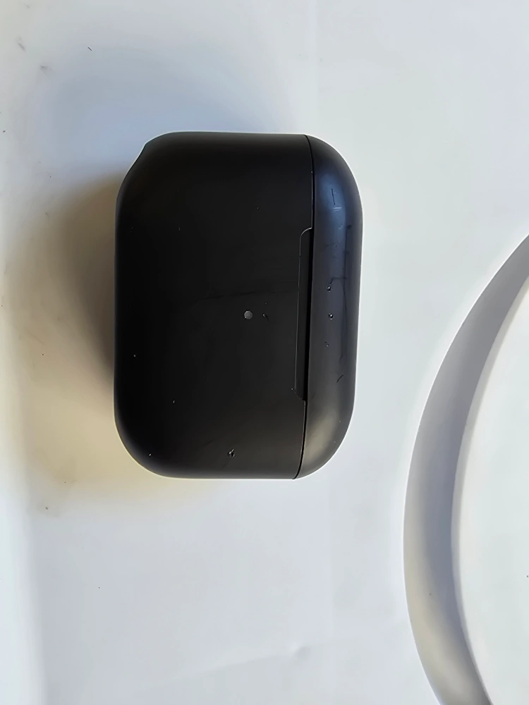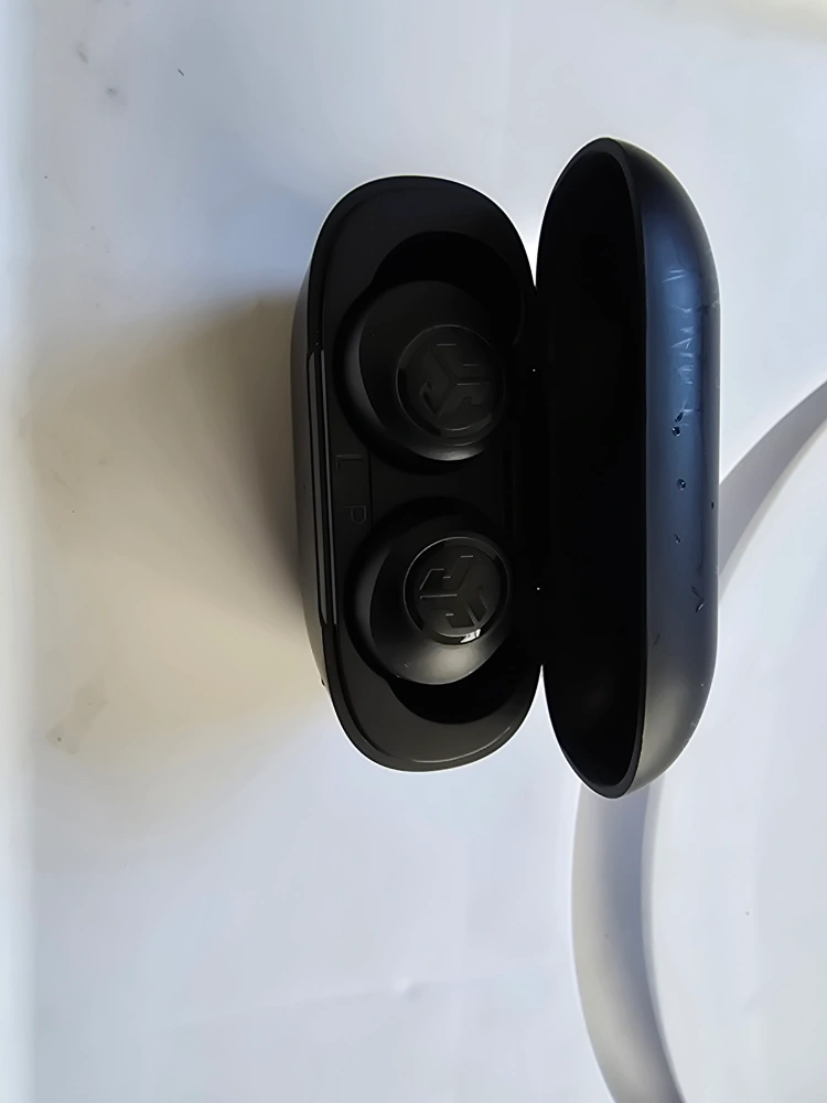 Black wireless earbuds. Charging case included. Portable and compact design. Good for listening to music or podcasts.