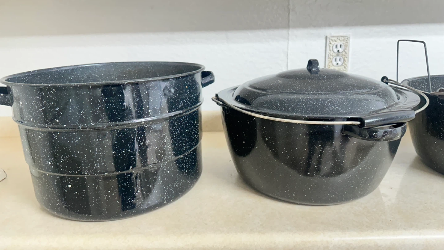 Includes a 22-quart canning pot with rack, a 10-quart steamer pot, and a 12-quart Granite Ware pot. These enamel-on-steel pots are great for canning, steaming, or large batch cooking. Exterior enamel has a speckled speckled blue and black pattern.